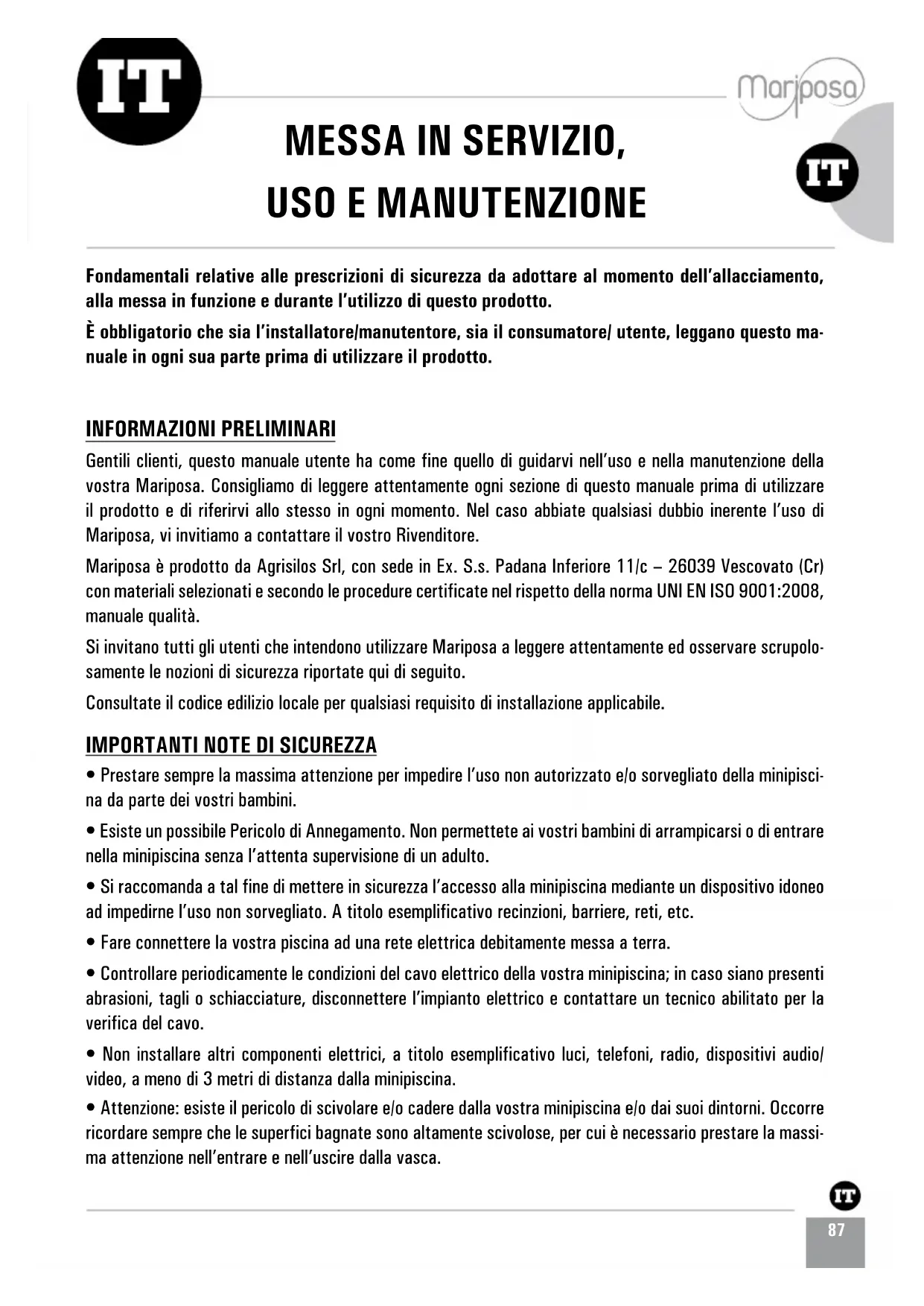 Fondamentali relative alle prescrizioni di sicurezza da adottare al momento dell’allacciamento, alla messa in funzione e durante l’utilizzo di questo prodotto. È obbligatorio che sia l’installatore/manutentore, sia il consumatore/ utente, leggano questo ma- nuale in ogni sua parte prima di utilizzare il prodotto. INFORMAZIONI PRELIMINARI Gentili clienti, questo manuale utente ha come fine quello di guidarvi nell’uso e nella manutenzione della vostra Mariposa. Consigliamo di leggere attentamente ogni sezione di questo manuale prima di utilizzare il prodotto e di riferirvi allo stesso in ogni momento. Nel caso abbiate qualsiasi dubbio inerente l’uso di Mariposa, vi invitiamo a contattare il vostro Rivenditore. Mariposa è prodotto da Agrisilos Srl, con sede in Ex. S.s. Padana Inferiore 11/c – 26039 Vescovato (Cr) con materiali selezionati e secondo le procedure certificate nel rispetto della norma UNI EN ISO 9001:2008, manuale qualità. Si invitano tutti gli utenti che intendono utilizzare Mariposa a leggere attentamente ed osservare scrupolo- samente le nozioni di sicurezza riportate qui di seguito. Consultate il codice edilizio locale per qualsiasi requisito di installazione applicabile.