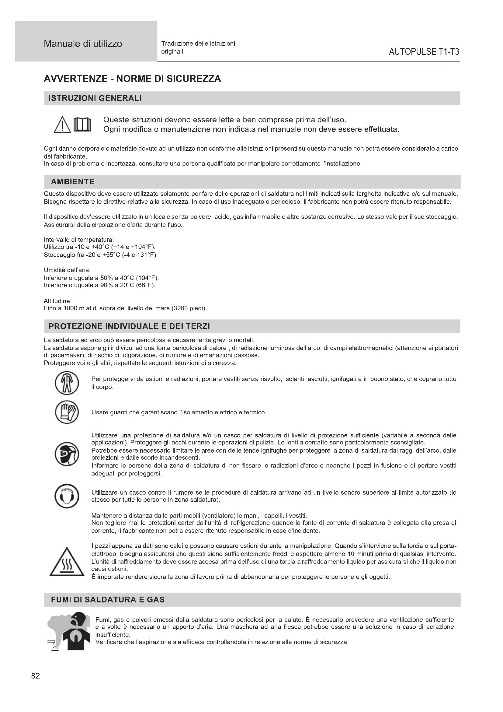 Questo dispositivo deve essere utilizzato solamente per fare delle operazioni di saldatura nei limiti indicati sulla targhetta significativa e/o sul manuale. Bisogna rispetto le direttive relative alla sicurezza. In caso di uso inadguato o pericoloso, il fabbricante non potra essere ritenuto responsable.