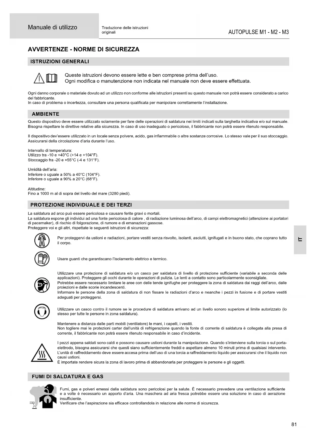 Il gas uscendo dalle bombole potrebbe essere fonte di asssia in caso di concentrazione nello spazio di saldatura (ventilare correttamente). Il trasporto deve essere fatto in sicurezza: bombole chiuse e dispositivo spento. Queste devono essere messe verticalmente su un supporto per limitare il rischio di cadute. Chiudere la bombola tra un utilizzo ed un altro. Attenzione alle variazioni di temperatura e alle esposizioni al sole. La bombola non deve essere in contatto con amme, arco elettrico, torce, morsetti di terra o ogni altra fonte di calore o d’incandescenza. Tenerla lontano dai circuiti elettrici e di saldatura e non saldare mai una bombola sotto pressione. Attenzione durante l’apertura della valvola di una bombola, bisogna allontanare la testa dai raccordi e assicurarsi che il gas usato sia appropriato al procedimento di saldatura. SICUREZZA ELETTRICA La rete elettrica usata deve imperativamente avere una messa a terra. Usare la grandezza del fusibile consigliata sulla tabella segnaletica. Una scarica elettrica potrebbe essere fonte di un grave incidente diretto, indiretto, o anche mortale. Non toccare mai le parti sotto tensione all’interno o all’esterno della fonte di corrente di saldatura quando quest’ultima è alimentata (Torce,pinze, cavi, elettrodi) perché sono collegate al circuito di saldatura. Prima di aprire la fonte di corrente di saldatura, bisogna disconnetterla dalla rete e attendere 2 min. anché l’insieme dei condensatori sia scarico. Non toccare nello stesso momento la torcia e il morsetto di massa. Far sostituire i cavi e le torce danneggiati solo da persone abilitate e qualicate. Dimensionare la sezione dei cavi in funzione dell’applicazione. Utilizzare sempre vestiti asciutti e in buono stato per isolarsi dal circuito di saldatura. Portare scarpe isolanti, indierentemente dall’ambiente di lavoro. CLASSIFICAZIONE CEM DEL DISPOSITIVO (VERSIONE 230 V) Questo dispositivo di Classe A non è fatto per essere usato in una zona residenziale dove la corrente elettrica è fornita dal sistema pubblico di alimentazione a basa tensione. Potrebbero esserci dicoltà potenziali per assicurare la compatibilità elettromagnetica in questi siti, a causa delle perturbazioni condotte o irradiate. Questi dispositivi sono conformi alla CEI 61000-3-12. A condizione che l’impedenza della rete pubblica di alimentazione bassa tensione nel punto di aggancio comune sia inferiore a Zmax = 0.349 Ohms, questo dispositivo è conforme alla CEI 61000-3-11 e può essere collegato alla rete pubblica di alimentazione bassa tensione. E’ quindi responsabilità dell’installatore o dell’utilizzatore del dispositivo assicurarsi, consultando l’operatore della rete di distribuzione, se necessario, che l’impedenza di rete sia conforme alle restrizioni d’impedenza. EMISSIONI ELETTRO-MAGNETICHE La corrente elettrica che attraversa un qualsiasi conduttore produce dei campi elettrici e magnetici (EMF) localizzati. La corrente di saldatura produce un campo elettromagnetico attorno al circuito di saldatura e al dispositivo di saldatura. I campi elettromagnetici EMF possono disturbare alcuni impianti medici, per esempio i pacemaker. Devono essere attuate delle misure di protezione per le persone che portano impianti medici. Per esempio, restrizioni di accesso per i passanti o una valutazione del rischio individuale per i saldatori.IT