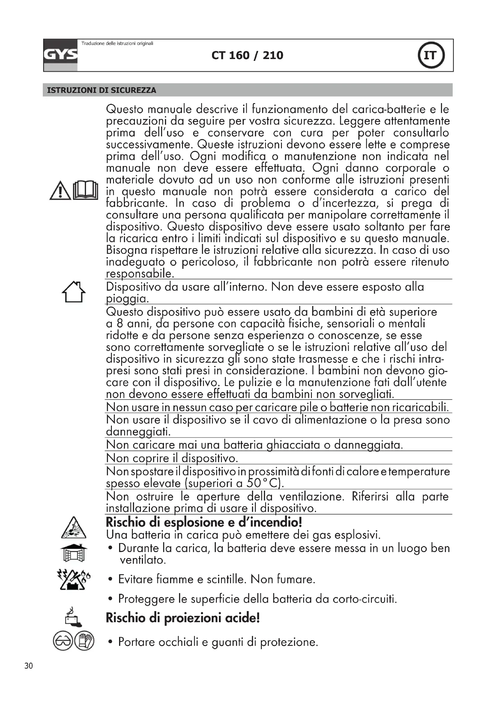 Questo manuale descrive il funzionamento del carica-batterie e le precauzioni da seguire per vostra sicurezza. Leggere attentamente prima dell’uso e conservare con cura per poter consultarlo successivamente. Queste istruzioni devono essere lette e comprese prima dell’uso. Ogni modifica o manutenzione non indicata nel manuale non deve essere effettuata. Ogni danno corporale o materiale dovuto ad un uso non conforme alle istruzioni presenti in questo manuale non potrà essere considerata a carico del fabbricante. In caso di problema o d’incertezza, si prega di consultare una persona qualificata per manipolare correttamente il dispositivo. Questo dispositivo deve essere usato soltanto per fare la ricarica entro i limiti indicati sul dispositivo e su questo manuale. Bisogna rispettare le istruzioni relative alla sicurezza. In caso di uso inadeguato o pericoloso, il fabbricante non potrà essere ritenuto responsabile. Dispositivo da usare all’interno. Non deve essere esposto alla pioggia. Questo dispositivo può essere usato da bambini di età superiore a 8 anni, da persone con capacità fisiche, sensoriali o mentali ridotte e da persone senza esperienza o conoscenze, se esse sono correttamente sorvegliate o se le istruzioni relative all’uso del dispositivo in sicurezza gli sono state trasmesse e che i rischi intra- presi sono stati presi in considerazione. I bambini non devono gio- care con il dispositivo. Le pulizie e la manutenzione fati dall’utente non devono essere effettuati da bambini non sorvegliati. Non usare in nessun caso per caricare pile o batterie non ricaricabili. Non usare il dispositivo se il cavo di alimentazione o la presa sono danneggiati. Non caricare mai una batteria ghiacciata o danneggiata. Non coprire il dispositivo. Non spostare il dispositivo in prossimità di fonti di calore e temperature spesso elevate (superiori a 50°C). Non ostruire le aperture della ventilazione. Riferirsi alla parte installazione prima di usare il dispositivo. Rischio di esplosione e d’incendio! Una batteria in carica può emettere dei gas esplosivi.