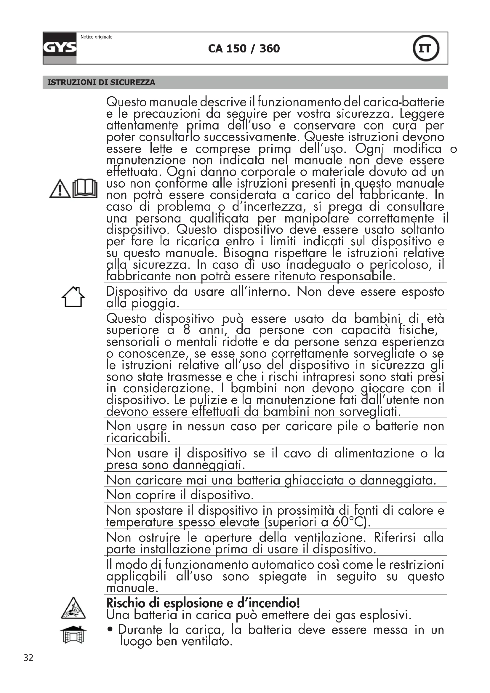Notice originale CONSIGLI ◊ Caricare la batteria Durante la ricarica disconnettere dalla batteria tutti i sistemi elettronici (non ricaricare la batteria quando questa è connessa alla macchina). ◊ Accensione Non accendere il veicolo con il caricabatterie connesso alla batteria. Questo danneggierà il fusibile. ◊ Problemi Una ricarica veloce può causare problemi: - Il fusibile stoppa la carica. - L’indicatore luminoso OK è acceso ma senza che la batteria sia carica, si accende e si spegne regolarmente. In questo caso riaccendere il caricabatteria dopo aver selezionato la più lenta modalità di ricarica disponibile ◊ Protezione termica Il caricabatterie è munito di termostato. Se diventa troppo caldo, il caricabatteria smetterà di funzionare. Posizionare l’unità in una stanza ventilatà, aspettare che si rareddi prima di riaccendere il caricabatteria (aspettare 10-20 minuti) ◊ Fusibile Il fusibile proteggerà l’unità nei seguenti casi: Inversione di polarità o morsetti in corto circuito. - Accensione del veicolo mentre la batteria è connessa al caricatore. - Corrente di carica in modalità boost troppo lunga o troppo alta e sopra il valore nominale della modalità di carica standard. Nel caso di rottura del fusibile, disconnettere i morsetti dalla batteria, spegnere l’unità, cambiare il fusibile, impostare il caricatore al minimo di potenza di carica possibile e riconnettere tutto come indicato in precedenza. CA 150 CA 360 Primary fuse (No Gys reference for sells) Cylindrical 5×20mm - T3.15A Littelfuse reference : 02153.15MXP (No Gys reference for sells) Cylindrical 5× 20mm - T5A Littelfuse reference : 0215005.MXP Secondary fuse Gys reference : 054516 Type : ATOF blade - 25A Littelfuse reference : 287025.PXPV Gys reference : 054622 Type: BF1 – M5 - 32V 50A Littelfuse reference : 153.5631.5502 ◊ Batteria solfatata Queste batterie rimaste troppo a lungo senza manutenzione sono a volte ricaricabili. Si riconoscono quando al mo- mento della carica, la lancetta dell’amperometro non si sposta (resta a 0) o se in modalità automatica il caricabatterie si interrompe rapidamente. In questo caso, mettere in posizione manuale (CA 360) poi mettere il commutatore sul livello più forte e controllare il caricabatterie minuto per minuto. Se dopo 5 ore la lancetta non si sposta la batteria è denitivamente fuori uso.