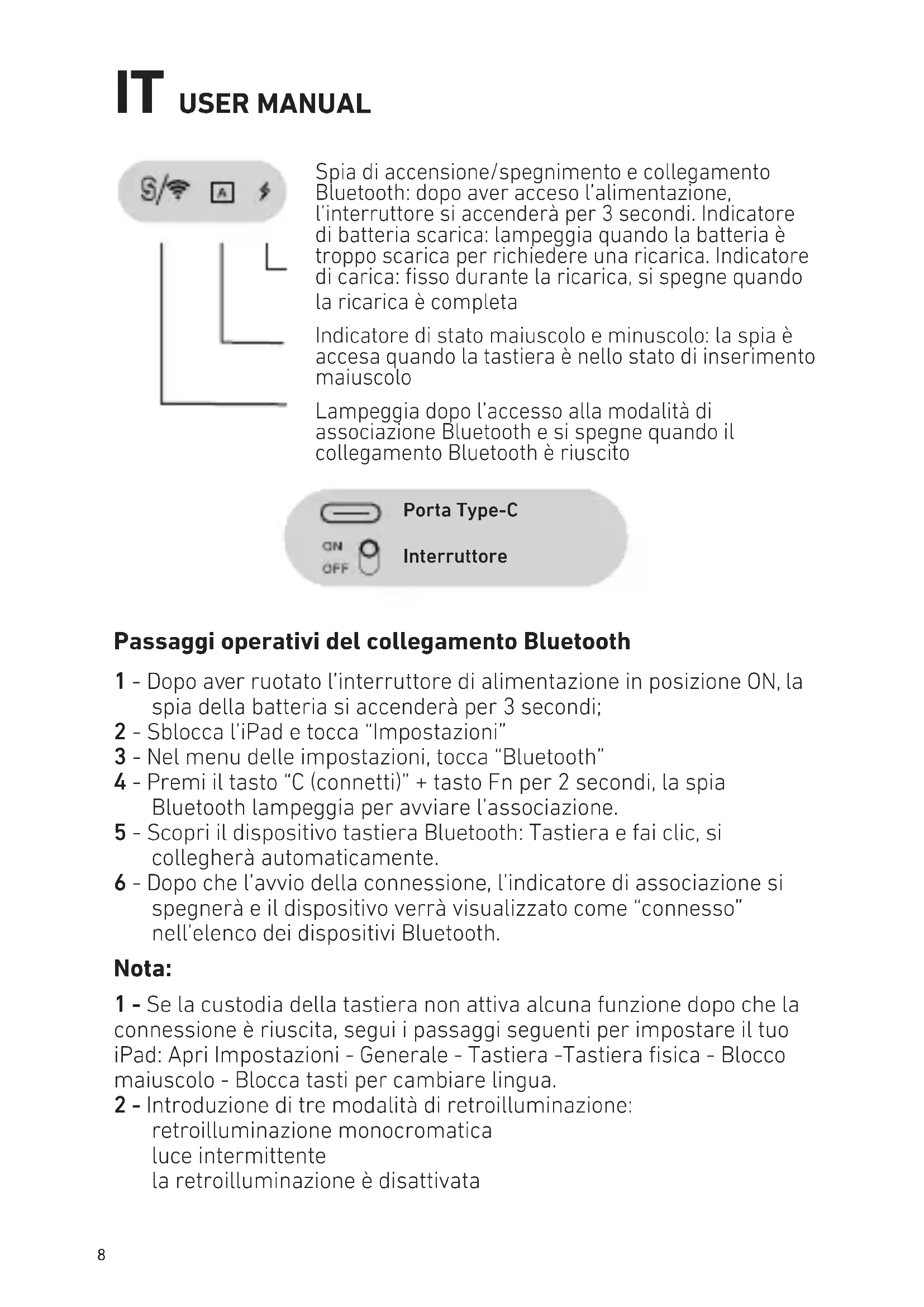 retroilluminazione monocromatica luce intermittente la retroilluminazione è disattivata Spia di accensione/spegnimento e collegamento Bluetooth: dopo aver acceso l’alimentazione, l’interruttore si accenderà per 3 secondi. Indicatore di batteria scarica: lampeggia quando la batteria è troppo scarica per richiedere una ricarica. Indicatore di carica: fisso durante la ricarica, si spegne quando la ricarica è completa Indicatore di stato maiuscolo e minuscolo: la spia è accesa quando la tastiera è nello stato di inserimento maiuscolo Lampeggia dopo l’accesso alla modalità di associazione Bluetooth e si spegne quando il collegamento Bluetooth è riuscito Porta Type-CInterruttore9 Gesti del touchpad (per sistema iOS 13 o superiore) Keyboard shortcuts Torna all’interfaccia principale Cerca Brano precedente Associazione Bluetooth + FN Seleziona tutto Attivazione/disattivazione del pannello touch Fn funzione composita Diminuzione della luminosità Tastiera sullo schermo Riproduci/Pausa Volume - Copia Regolazione della luminosità della retroilluminazioneConversione del colore della luce Più Luminosità Cambio lingua Prossimo brano Volume + Incolla Blocco schermo Pulsante sinistro del mouse (personalizzabile) Trascina l’elemento: tocca due volte con un dito per continuare a muoverti Movimento del cursore, movimento di un dito Operazione con un solo dito Cambia APP a destra: scorri dal bordo sinistro verso quello destro Cambia APP a sinistra: scorri dal bordo destro a quello sinistro Apri lo switcher APP: scorri verso il basso dal bordo superiore Apri il programma: scorri verso l’alto dal bordo inferiore10 Pulsante destro del mouse (personalizzabile) Ingrandisci (per browser) Pulsante centrale del mouse (personalizzabile) Torna alla schermata iniziale: scorri verso l’alto con tre dita Screenshot: tocco con quattro dita Sposta l’APP a destra (modalità barra delle applicazioni): tre dita si spostano a destra Rimpicciolisci (per browser) Sposta l’APP a sinistra (modalità barra delle attività): tre dita si spostano a sinistra Scorri a sinistra e a destra: doppio movimento orizzontale Scorri su e giù, scorri con due dita verticalmente Avvertenza