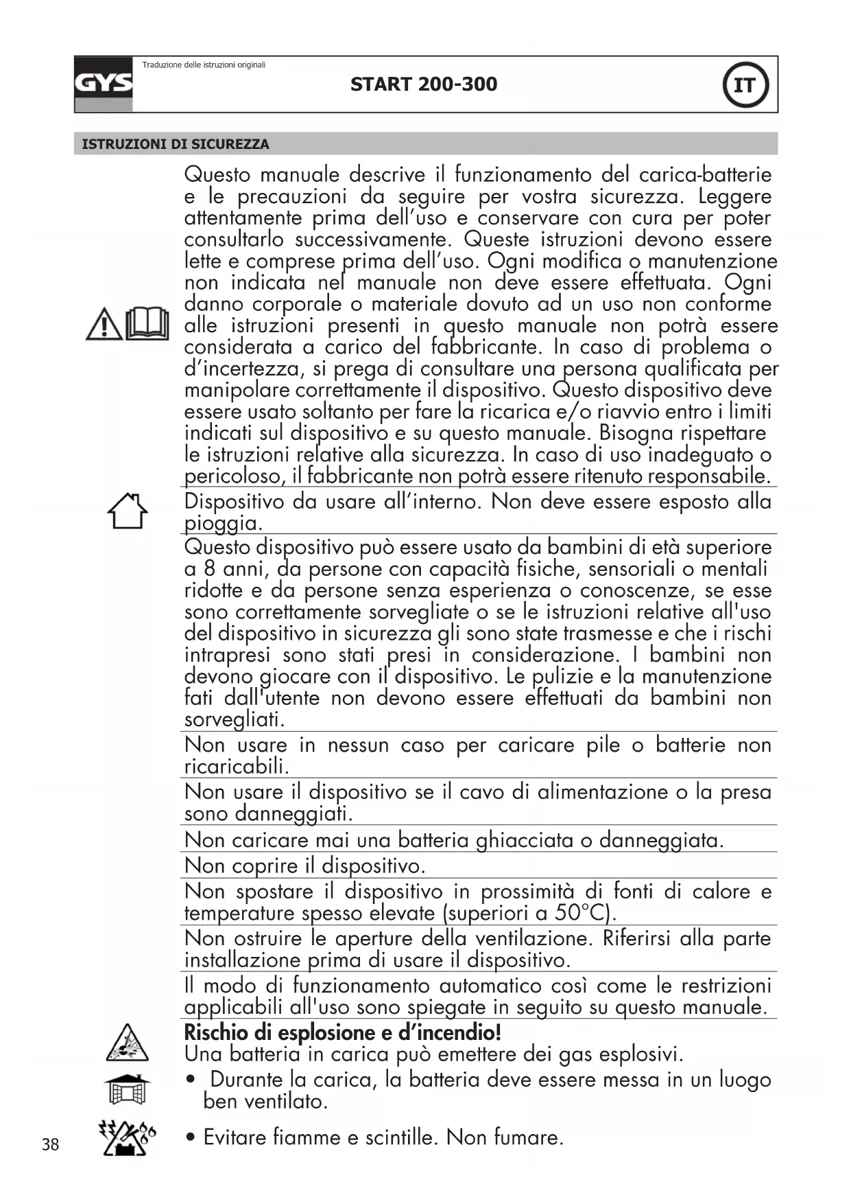 Questo manuale descrive il funzionamento del carica-batterie e le precauzioni da seguire per vostra sicurezza. Leggere attentamente prima dell’uso e conservare con cura per poter consultarlo successivamente. Queste istruzioni devono essere lette e comprese prima dell’uso. Ogni modica o manutenzione non indicata nel manuale non deve essere effettuata. Ogni danno corporale o materiale dovuto ad un uso non conforme alle istruzioni presenti in questo manuale non potrà essere considerata a carico del fabbricante. In caso di problema o d’incertezza, si prega di consultare una persona qualicata per manipolare correttamente il dispositivo. Questo dispositivo deve essere usato soltanto per fare la ricarica e/o riavvio entro i limiti indicati sul dispositivo e su questo manuale. Bisogna rispettare le istruzioni relative alla sicurezza. In caso di uso inadeguato o pericoloso, il fabbricante non potrà essere ritenuto responsabile. Dispositivo da usare all’interno. Non deve essere esposto alla pioggia. Questo dispositivo può essere usato da bambini di età superiore a 8 anni, da persone con capacità siche, sensoriali o mentali ridotte e da persone senza esperienza o conoscenze, se esse sono correttamente sorvegliate o se le istruzioni relative all'uso del dispositivo in sicurezza gli sono state trasmesse e che i rischi intrapresi sono stati presi in considerazione. I bambini non devono giocare con il dispositivo. Le pulizie e la manutenzione fati dall'utente non devono essere effettuati da bambini non sorvegliati. Non usare in nessun caso per caricare pile o batterie non ricaricabili. Non usare il dispositivo se il cavo di alimentazione o la presa sono danneggiati. Non caricare mai una batteria ghiacciata o danneggiata. Non coprire il dispositivo. Non spostare il dispositivo in prossimità di fonti di calore e temperature spesso elevate (superiori a 50°C). Non ostruire le aperture della ventilazione. Riferirsi alla parte installazione prima di usare il dispositivo. Il modo di funzionamento automatico così come le restrizioni applicabili all'uso sono spiegate in seguito su questo manuale. Rischio di esplosione e d’incendio! Una batteria in carica può emettere dei gas esplosivi.