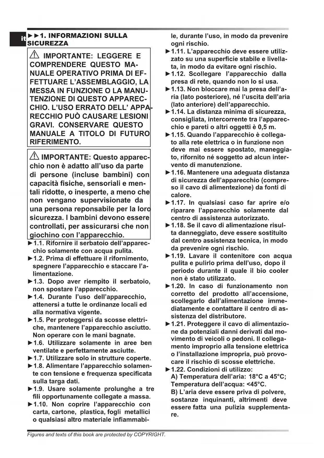 RIFERIMENTO. IMPORTANTE: Questo apparec- chio non è adatto all’uso da parte di persone (incluse bambini) con capacità siche, sensoriali e men- tali ridotte, o inesperte, a meno che non vengano supervisionate da una persona reponsabile per la loro sicurezza. I bambini devono essere controllati, per assicurarsi che non giochino con l’apparecchio. ►1.1. Rifornire il serbatoio dell’apparec- chio solamente con acqua pulita. ►1.2. Prima di eettuare il rifornimento, spegnere l’apparecchio e staccare l’a- limentazione. ►1.3. Dopo aver riempito il serbatoio, non spostare l’apparecchio. ►1.4. Durante l’uso dell’apparecchio, attenersi a tutte le ordinanze locali ed alla normativa vigente. ►1.5. Per proteggersi da scosse elettri- che, mantenere l’apparecchio asciutto. Non operare con le mani bagnate. ►1.6. Utilizzare solamente in aree ben ventilate e perfettamente asciutte. ►1.7. Utilizzare solo in strutture coperte. ►1.8. Alimentare l’apparecchio solamen- te con tensione e frequenza specicata sulla targa dati. ►1.9. Usare solamente prolunghe a tre li opportunamente collegate a massa. ►1.10. Non coprire l’apparecchio con carta, cartone, plastica, fogli metallici o qualsiasi altro materiale inammabi- le, durante l’uso, in modo da prevenire ogni rischio. ►1.11. L’apparecchio deve essere utiliz- zato su una supercie stabile e livella- ta, in modo da evitare ogni rischio. ►1.12. Scollegare l’apparecchio dalla presa di rete, quando non lo si usa. ►1.13. Non bloccare mai la presa dell’a- ria (lato posteriore), né l’uscita dell’aria (lato anteriore) dell’apparecchio. ►1.14. La distanza minima di sicurezza, consigliata, intercorrente tra l’apparec- chio e pareti o altri oggetti è 0,5 m. ►1.15. Quando l’apparecchio è collega- to alla rete elettrica o in funzione non deve mai essere spostato, maneggia- to, rifornito né soggetto ad alcun inter- vento di manutenzione. ►1.16. Mantenere una adeguata distanza di sicurezza dell’apparecchio (compre- so il cavo di alimentezione) da fonti di calore. ►1.17. In qualsiasi caso far aprire e/o riparare l’apparecchio solamente dal centro di assistenza autorizzato. ►1.18. Se il cavo di alimentazione risul- ta danneggiato, deve essere sostituito dal centro assistenza tecnica, in modo da prevenire ogni rischio. ►1.19. Lavare il contenitore con acqua pulita e pulirlo prima dell’uso, dopo il periodo durante il quale il bio cooler non è stato utilizzato. ►1.20. In caso di funzionamento non corretto del prodotto all’accensione, scollegarlo dall’alimentazione imme- diatamente e contattare il centro di as- sistenza del distributore. ►1.21. Proteggere il cavo di alimentazio- ne da potenziali danni derivati dal mo- vimento di veicoli o pedoni. Il collega- mento improprio alla tensione elettrica o l’installazione impropria, può provo- care il rischio di scosse elettriche. ►1.22. Condizioni di utilizzo: A) Temperatura dell’aria: 18°C a 45°C; Temperatura dell’acqua: <45°C. B) L’aria deve essere priva di polvere, sostanze inquinanti, altrimenti deve essere fatta una pulizia supplementa- re. Figures and texts of this book are protected by COPYRIGHT.it ►1.23. L’acqua usata per il riempimen- to del serbatoio del rarescatore, deve provenire da un acquedotto. Nel caso non sia possibile attingere da un ac- quedotto, l’acqua introdotta deve es- sere sottoposta ad un trattamento di sanicazione, secondo direttiva euro- pea 98/83/CE. -Si consiglia di impiegare acqua con durezza inferiore a 15°f. -Il serbatoio del rarescatore, deve es- sere svuotato e sanicato periodica- mente a seconda dell’utilizzo. -Le superci dei pad, devono essere ispezionate e sanicate periodicamen- te a seconda dell’utilizzo. -Per le operazioni di sanicazione, de- vono essere impiegati prodotti biocidi conformi al regolamento europeo n° 582/2012. ►►2. DISIMBALLAGGIO ►2.1. Rimuovere tutti i materiali di imbal- laggio usati per confezionare e spedire l’apparecchio e smaltirli secondo le norme vigenti. ►2.2. Estrarre tutti gli articoli dall’imballo. ►2.3. Controllare eventuali danni subiti du- rante il trasporto. Se l’apparecchio appare danneggiato, informare immediatamente il concessionario presso il quale è stato acquistato. ►►3. ASSEMBLAGGIO L’apparecchio è dotato di ruote per agevo- lare la movimentazione. A seconda del mo- dello, le ruote si possono trovare installate, oppure sono da installare. I componenti, completi della relativa bulloneria di montag- gio, sono situati all’interno dell’imballo (Fig. 1). ►►4. FUNZIONAMENTO AVVERTENZA: Leggere attentamente le ”INFORMAZIONI SULLA SICUREZZA”, prima di accendere l’apparecchio. AVVERTENZA: Usare solamente acqua pulita, per evitare guasti o altre anomalie. AVVERTENZA: Vericare la corretta messa a terra del vostro impianto elettrico. Il collegamento alla rete elettrica va fatto in accordo con le norme nazionali vigenti. Alimentare l’apparecchio solamente con tensione e frequenza specicata sulla targa dati. NOTA: Questi modelli possono essere collegati alla rete idrica, collegando il tubo al raccordo (Fig. 10). ►►4.1. ACCENSIONE: ►4.1.1. Aprire lo sportello del serbatoio (Fig. 2). ►4.1.2. Rifornire d’acqua il sebatoio (Fig. 3), il livello dell’acqua deve essere compreso tra MIN e MAX della scala graduata, posta sul anco dell’apparecchio (Fig. 4), al ne di evitare rischi. ►4.1.3. Chiudere lo sportello del serbatoio (Fig. 5). ►4.1.4. Collegare la spina di alimentazione alla rete elettrica (Fig. 6). ATTENZIONE: Quando viene collegata la spina di alimentazione alla rete elettrica, sul display viene visualizzata la misura approssimativa della temperatura ambiente. ►4.1.5. Premere il pulsante ON/OFF per accendere l’apparecchio (Fig. 9). ►►4.2. PANNELLO DI