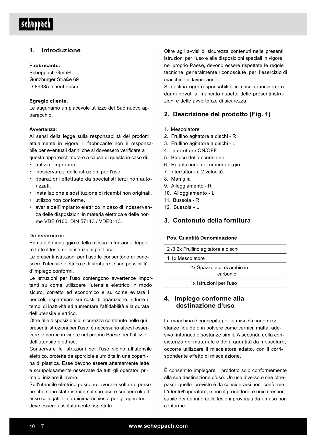 Problema Possibile causa Eliminazione Il motore non si avvia Mancala tensione di rete (mancanza di corrente). Controllare la protezione Cavo di collegamento difettoso Sostituire il cavo oppure lasciare controllare il cavo (tecnico specializzato in elettrotecnica). I cavi difettosi non devono più essere utilizzati Motore o interruttore difettosi Per la rimozione dei disturbi, rivolgersi al pro- duttore oppure ad un‘azienda da lui autorizzata Vibrazioni incon- suete Frullino difettoso Sostituire il frullino Testa portapezzo difettosa Per la rimozione dei disturbi, rivolgersi al pro- duttore oppure ad un‘azienda da lui autorizzata Miscela errata Lavorazione errata. Attenersi alle prescrizioni di lavorazione del produttore. L‘apparecchio si avvia, ma si blocca con carico ridotto e si spegne automaticamente. Cavo di prolunga troppo lungo o sezio- ne troppo piccola. Cavo di allacciamento con una sezione di alme- no 1,5 mm², è una lunghezza massima di 25 m. Presa troppo lontana dal collegamento principale e sezione del conduttore di collegamento troppo piccola Con i cavi lunghi la sezione deve essere alme- no di 2,5 mm².www.scheppach.com