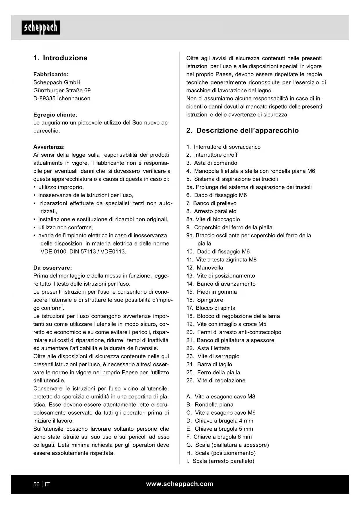 - avaria dell’impianto elettrico in caso di inosservanza delle disposizioni in materia elettrica e delle norme VDE 0100, DIN 57113 / VDE0113. Da osservare: Prima del montaggio e della messa in funzione, legge- re tutto il testo delle istruzioni per l‘uso. Le presenti istruzioni per l’uso le consentono di cono- scere l‘utensile e di sfruttare le sue possibilità d’impie- go conformi. Le istruzioni per l‘uso contengono avvertenze impor- tanti su come utilizzare l‘utensile in modo sicuro, cor- retto ed economico e su come evitare i pericoli, rispar- miare sui costi di riparazione, ridurre i tempi di inattività ed aumentare l‘adabilità e la durata dell‘utensile. Oltre alle disposizioni di sicurezza contenute nelle qui presenti istruzioni per l‘uso, è necessario altresì osser- vare le norme in vigore nel proprio Paese per l‘utilizzo dell‘utensile. Conservare le istruzioni per l’uso vicino all‘utensile, protette da sporcizia e umidità in una copertina di pla- stica. Esse devono essere attentamente lette e scru- polosamente osservate da tutti gli operatori prima di iniziare il lavoro. Sull‘utensile possono lavorare soltanto persone che sono state istruite sul suo uso e sui pericoli ad esso collegati. L‘età minima richiesta per gli operatori deve essere assolutamente rispettata.www.scheppach.com