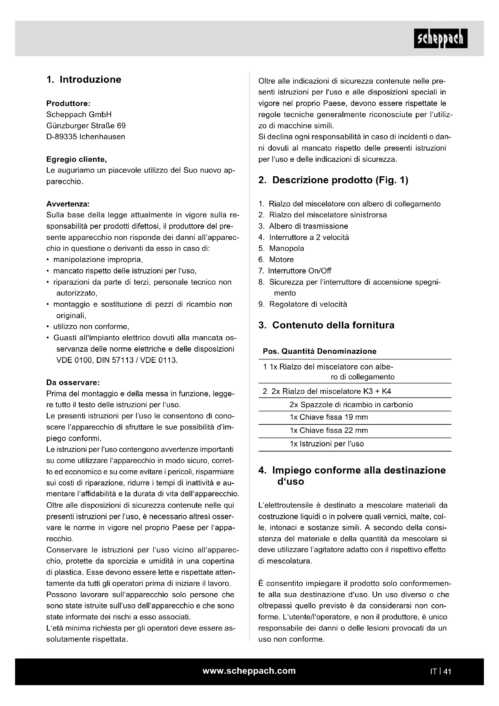 d‘uso L’elettroutensile è destinato a mescolare materiali da costruzione liquidi o in polvere quali vernici, malte, col- le, intonaci e sostanze simili. A secondo della consi- stenza del materiale e della quantità da mescolare si deve utilizzare l’agitatore adatto con il rispettivo eetto di mescolatura. È consentito impiegare il prodotto solo conformemen- te alla sua destinazione d‘uso. Un uso diverso o che oltrepassi quello previsto è da considerarsi non con- forme. L‘utente/l‘operatore, e non il produttore, è unico responsabile dei danni o delle lesioni provocati da un uso non conforme.www.scheppach.com