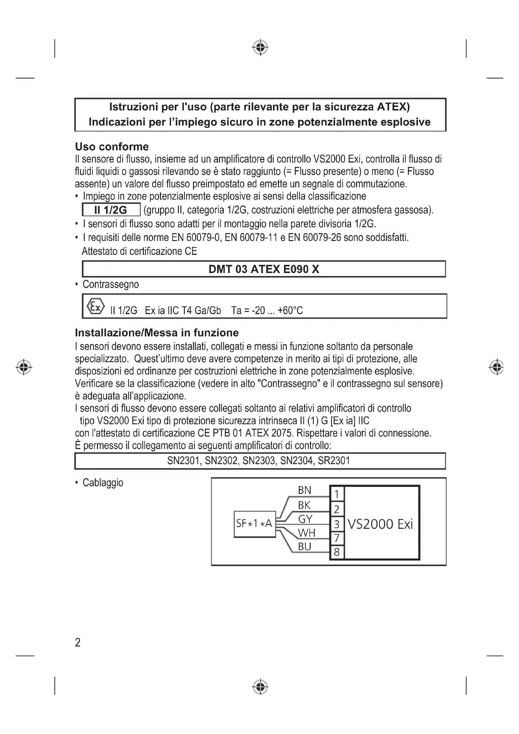 - Contrassegno II 1/2G Ex ia IIC T4 Ga/Gb Ta = -20 ... +60°C Installazione/Messa in funzione I sensori devono essere installati, collegati e messi in funzione soltanto da personale specializzato. Quest’ultimo deve avere competenze in merito ai tipi di protezione, alle disposizioni ed ordinanze per costruzioni elettriche in zone potenzialmente esplosive. Verificare se la classificazione (vedere in alto "Contrassegno" e il contrassegno sul sensore) è adeguata all’applicazione. I sensori di flusso devono essere collegati soltanto ai relativi amplificatori di controllo tipo VS2000 Exi tipo di protezione sicurezza intrinseca II (1) G [Ex ia] IIC con l'attestato di certificazione CE PTB 01 ATEX 2075. Rispettare i valori di connessione. È permesso il collegamento ai seguenti amplificatori di controllo: SN2301, SN2302, SN2303, SN2304, SR2301