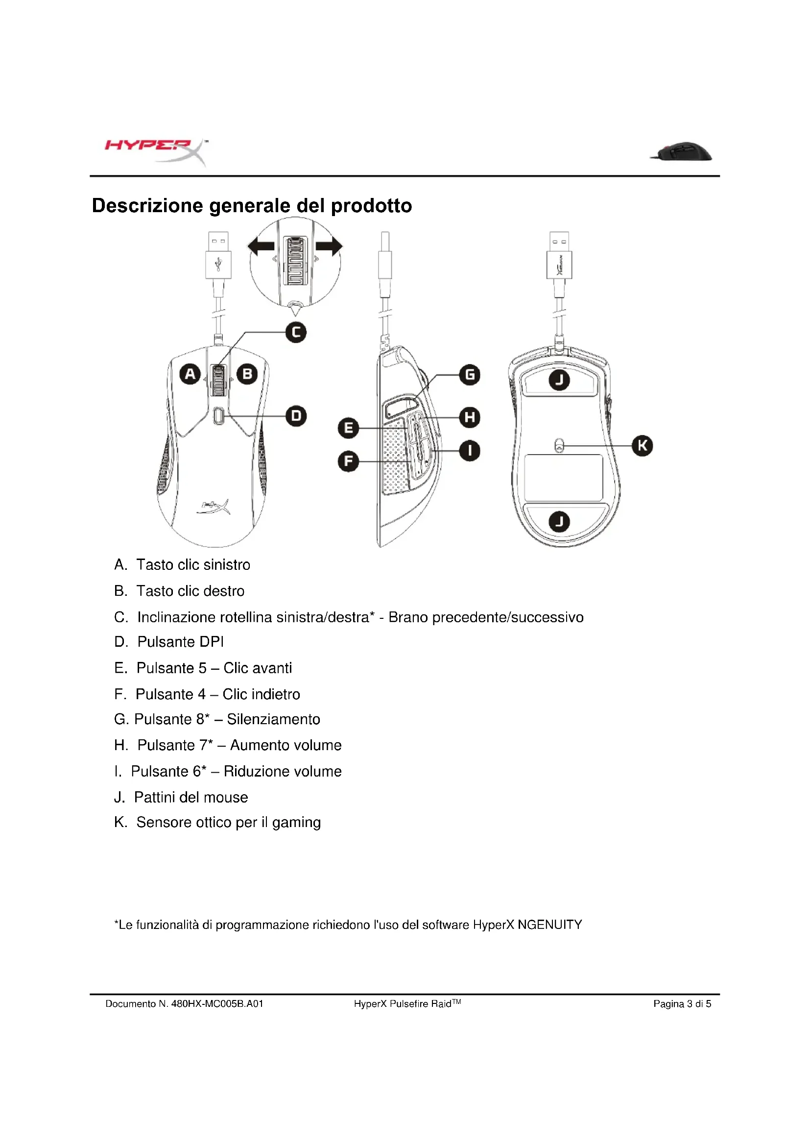 *Le funzionalità di programmazione richiedono l'uso del software HyperX NGENUITYDocumento N. 480HX-MC005B.A01 HyperX Pulsefire Raid