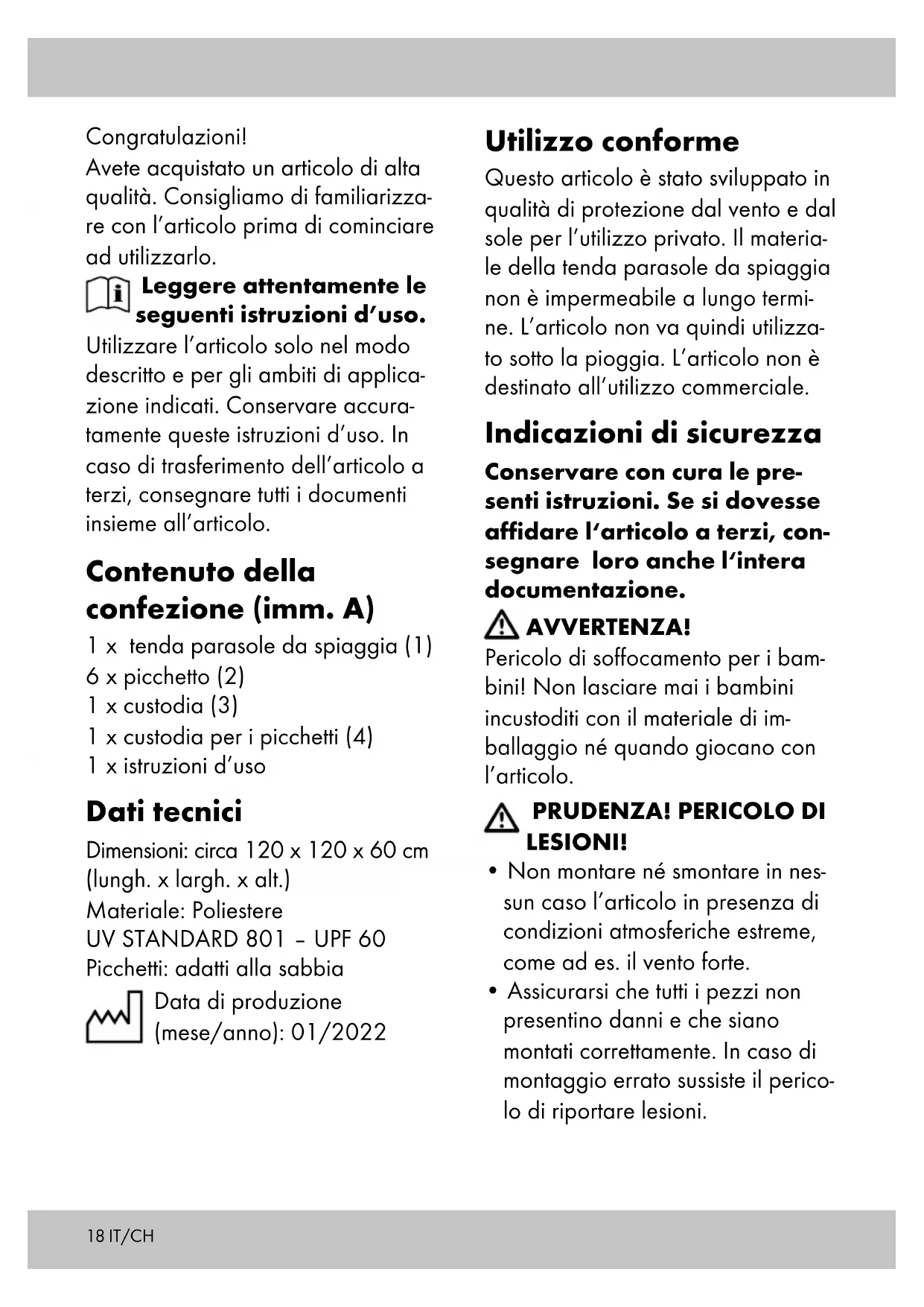 Picchetti: adatti alla sabbia Data di produzione (mese/anno): 01/2022 Utilizzo conforme Questo articolo è stato sviluppato in qualità di protezione dal vento e dal sole per l’utilizzo privato. Il materia- le della tenda parasole da spiaggia non è impermeabile a lungo termi- ne. L’articolo non va quindi utilizza- to sotto la pioggia. L’articolo non è destinato all’utilizzo commerciale. Indicazioni di sicurezza Conservare con cura le pre- senti istruzioni. Se si dovesse affidare l‘articolo a terzi, con- segnare loro anche l‘intera documentazione. AVVERTENZA! Pericolo di soffocamento per i bam- bini! Non lasciare mai i bambini incustoditi con il materiale di im- ballaggio né quando giocano con l’articolo.
