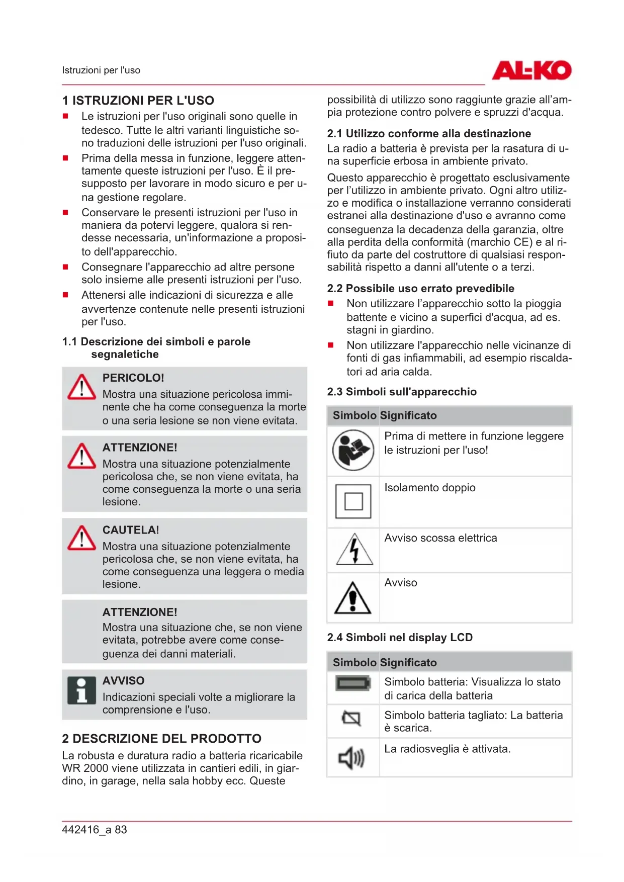 Scarica le istruzioni per il tuo Radio in formato PDF gratuitamente! Trova il tuo manuale WR 2000 - AL-KO e riprendi in mano il tuo dispositivo elettronico. In questa pagina sono pubblicati tutti i documenti necessari per l'utilizzo del tuo dispositivo. WR 2000 del marchio AL-KO.