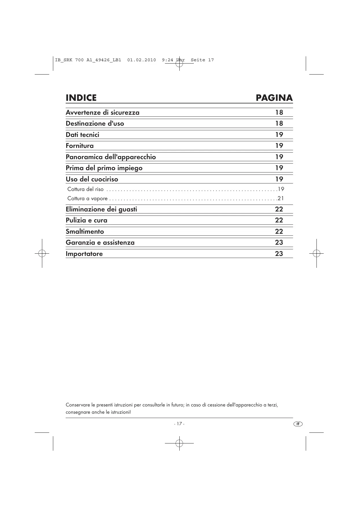 Conservare le presenti istruzioni per consultarle in futuro; in caso di cessione dell'apparecchio a terzi, consegnare anche le istruzioni!