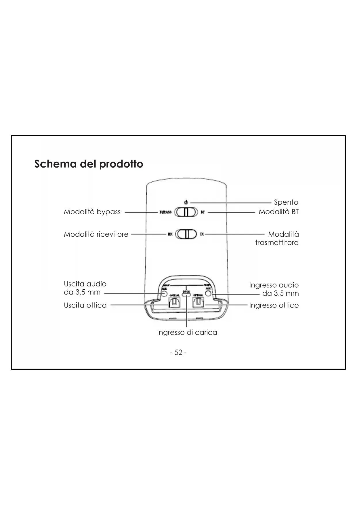 Specifiche- 52 - Schema del prodotto Modalità bypass Modalità ricevitore Uscita audio da 3,5 mm Uscita ottica Spento Modalità BT Modalità trasmettitore Ingresso audio da 3,5 mm Ingresso ottico Ingresso di caricaCollegare un’estremità del cavo audio (da 3,5 mm) o del cavo ottico Toslink incluso all’uscita audio (da 3,5 mm) del prodotto BR-O8. Collegare l’altra estremità del cavo ad una qualsiasi uscita audio. (cuffie, altoparlante o sistema stereo con cavo). È possibile anche collegare il cavo audio direttamente al prodotto BR-O8 Collegare BR-O8 ad una fonte di alimentazione con il cavo Micro USB Spostare l’interruttore RX/TX su “RX” e l’interruttore Alimentazione/Modalità sulla posizione “BT” Toccare e tenere premuto per 3 secondi e il prodotto BR-O8 entrerà nella modalità di associazione mentre l’indicatore dello stato della connessione lampeggerà di bianco in maniera rapida Attivare la funzione di associazione sul dispositivo audio wireless compatibile (uno smartphone ad esempio) e selezionare “AUKEY BR-O8” Una volta associato il dispositivo, una “A” verrà mostrata sullo schermo Se lo si vuole associare ad un secondo dispositivo audio wireless compatibile per una connessione doppia, ripetere le fasi 4 e 5 con il secondo dispositivo Una volta associato, una “A” e una “B” bianche verranno mostrate sullo schermo