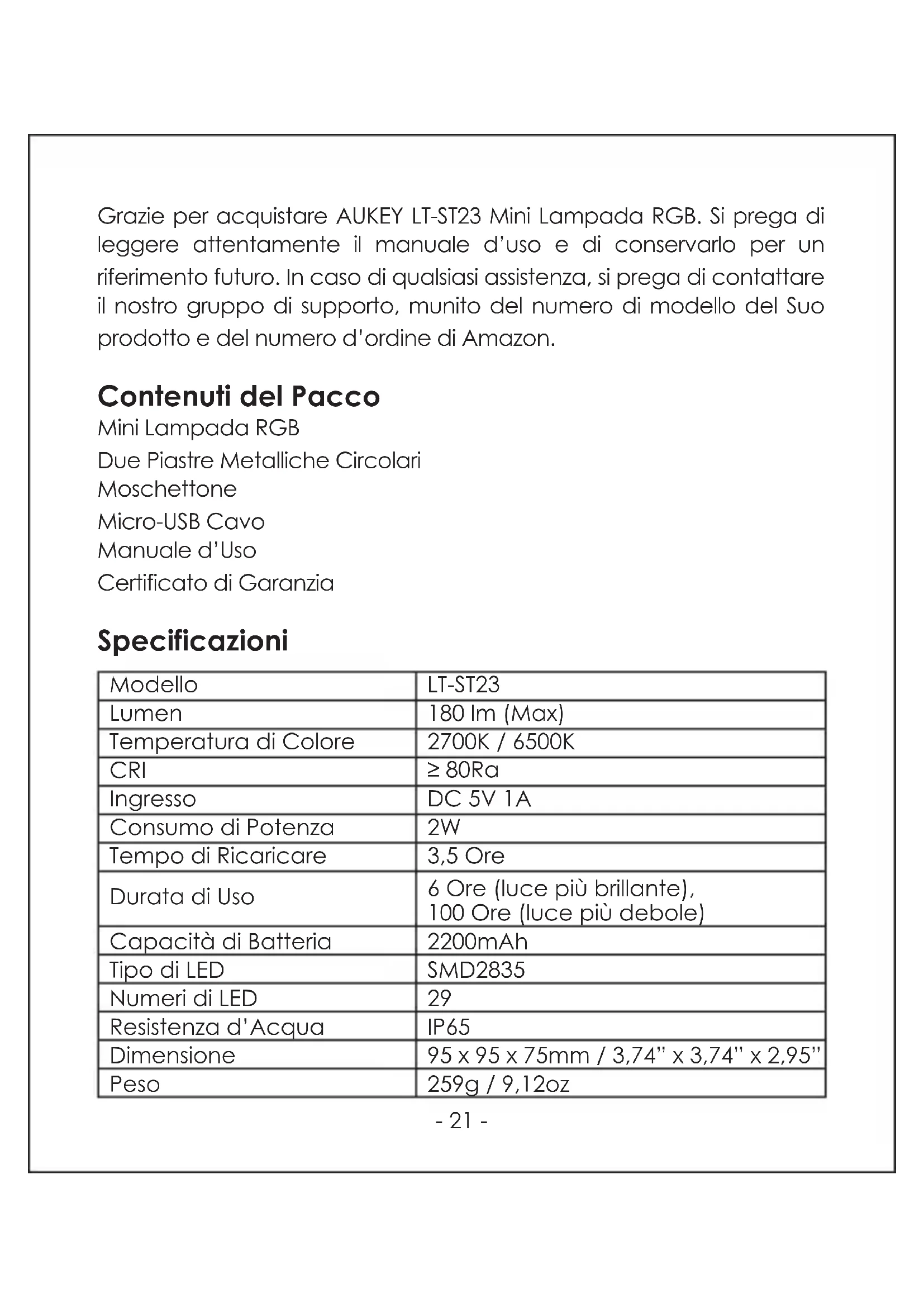 ●- 21 - Grazie per acquistare AUKEY LT-ST23 Mini Lampada RGB. Si prega di leggere attentamente il manuale d’uso e di conservarlo per un riferimento futuro. In caso di qualsiasi assistenza, si prega di contattare il nostro gruppo di supporto, munito del numero di modello del Suo prodotto e del numero d’ordine di Amazon. Contenuti del Pacco Mini Lampada RGB Due Piastre Metalliche Circolari Moschettone Micro-USB Cavo Manuale d’Uso Certificato di Garanzia Specificazioni Modello Lumen Temperatura di Colore CRI Ingresso Consumo di Potenza Tempo di Ricaricare Capacità di Batteria Tipo di LED Numeri di LED Resistenza d’Acqua Dimensione Peso 2200mAh SMD2835