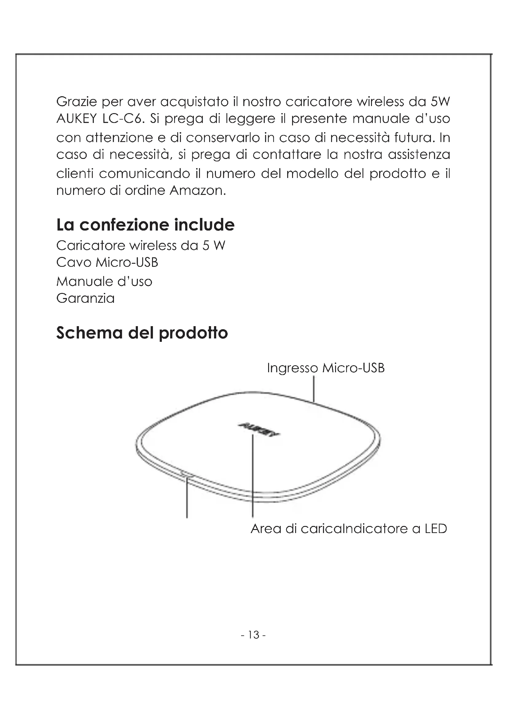 Cuidados del producto Indicador LED Indicador Verde Rojo Parpadeo rojo Estado Cargando / carga completada Modo de espera Error de carga- 13 - Grazie per aver acquistato il nostro caricatore wireless da 5W AUKEY LC-C6. Si prega di leggere il presente manuale d’uso con attenzione e di conservarlo in caso di necessità futura. In caso di necessità, si prega di contattare la nostra assistenza clienti comunicando il numero del modello del prodotto e il numero di ordine Amazon. La confezione include Caricatore wireless da 5 W Cavo Micro-USB Manuale d’uso Garanzia Schema del prodotto Ingresso Micro-USB Area di caricaIndicatore a LED- 14 - Collegare il prodotto LC-C6 ad una presa a muro con un caricatore USB a parete (non incluso) e il cavo micro-USB incluso. L’indicatore a LED si illuminerà di rosso. Posizionare il proprio smartphone, compatibile con la tecnologia Qi, sul caricatore wireless. L’indicatore a LED si illuminerà di colore verde e lo smartphone caricherà alla velocità standard. Carica wireless per gli smartphone che non supportano questa modalità di ricarica Per caricare smartphone che non supportano una carica wireless, è necessario utilizzare un ricevitore di carica wireless (non incluso).