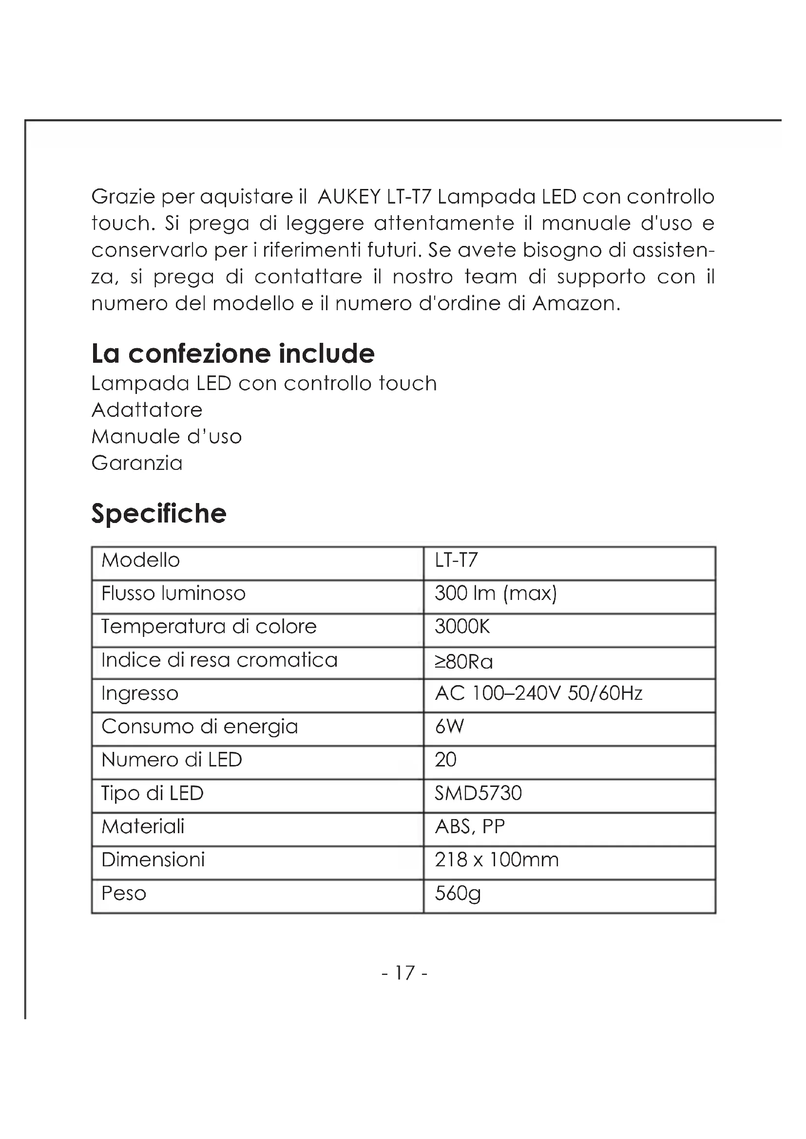 Grazie per aquestare il AUKEY LT-T7 Lampada LED con controllo touch. Si prega di leggere attendamente il manuale d'uso e conservarlo per i riferimenti futuri. Se avete bisogno di assistenza, si prega di contattare il nostro team di supporto con il numero del modello e il numero d'ordine di Amazon.