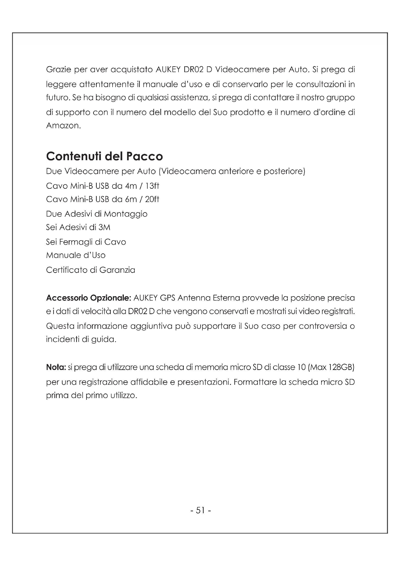 Eliminación y Bloqueo / Desbloqueo de los Fotos y Vídeos ● Presione para eliminar or para bloquear / desbloquear los archivos de fotos o de vídeos después de selecsionarlo en la lista de reproducir. Si se está reproduciendo un video, presione para detenerlo y luego presione para elimanar o para bloquear / desbloquear ● Las fotos y los videos no se pueden recuperar una vez que sea eliminados ● Si se bloquea una foto o un video, se protegerá y no se sobrescribirá Cuidado & Uso del Producto ● Asegúrese de que la cámara y el soporte estén fijados firmemente en el lugar antes de usarla para evitar las caídas ● Mantener alejado de los líquidos, calores extremos y fuertes campos magnéticos ● Evite tocar la superficie de la lente. Se puede limpiar con un bastoncillo de algodón o un papel de limpieza para lentes. Si es difícil a quitarse cualquier suciedad, se puede usar un limpiador no-abrasivo de lentes de gafas . No utilice unas cosas corrosivas ● Mantenga las copias de seguridad de los videos y las fotos importantes en otros lugares para protegerse de la corrupción de los archivos o la pérdida causada por cualquier problema de tarjeta SD- 50 - Garantía & Apoyo al Cliente Para preguntas, soportes o reclamaciones de garantía, póngase en contacto con nosotros en la dirección que se correspondan con su región. Inclúyase por favor su número de orden de Amazon y número de modelo del producto. Pedidos de Amazon EU: support.eu@aukey.com *Observe por favor, AUKEY puede proporcionar solamente el servicio after-sales para los productos comprados directamente de AUKEY. Si usted ha comprado de un vendedor diferente, póngase en contacto con ellos directamente por cuestiones de servicio o garantía por favor.- 51 - Grazie per aver acquistato AUKEY DR02 D Videocamere per Auto. Si prega di leggere attentamente il manuale d’uso e di conservarlo per le consultazioni in futuro. Se ha bisogno di qualsiasi assistenza, si prega di contattare il nostro gruppo di supporto con il numero del modello del Suo prodotto e il numero d'ordine di Amazon. Contenuti del Pacco Due Videocamere per Auto (Videocamera anteriore e posteriore) Cavo Mini-B USB da 4m / 13ft Cavo Mini-B USB da 6m / 20ft Due Adesivi di Montaggio Sei Adesivi di 3M Sei Fermagli di Cavo Manuale d’Uso Certificato di Garanzia Accessorio Opzionale: AUKEY GPS Antenna Esterna provvede la posizione precisa e i dati di velocità alla DR02 D che vengono conservati e mostrati sui video registrati. Questa informazione aggiuntiva può supportare il Suo caso per controversia o incidenti di guida. Nota: si prega di utilizzare una scheda di memoria micro SD di classe 10 (Max 128GB) per una registrazione affidabile e presentazioni. Formattare la scheda micro SD prima del primo utilizzo.- 52 - Diagramma del Prodotto Videocamera Anteriore Ingresso d’Alimentazione Mini-B USB Ingresso GPS Ingresso AV USB Mini-B Clip del Montaggio di Blocco Lente Microfono Indicatore LED di Esterno Pulsante di Reset Fessura della Scheda Micro SD- 53 - Uscita AV USB Mini-B AV Indicatore LED di Esterno Lente Clip del Montaggio di Blocco Videocamera Posteriore 1080P+1080P 00:01:14 2049/08/13 22:15:06 Schermo Pulsanti di Controllo Indicatore LED di Interno Indicatore di Schermo- 54 - Specificazioni Modello Sensore d’Immagine CPU Schermo Angolo di Visione Apertura Valore d’Esposizione Risoluzioni di Registrazione Formato d’Immagine Registrazione di Suono Modalità di Registrazione Sensibilità del Sensore di Gravità Scheda Micro SD Ingresso Temperatura d’Operazione Materiali Dimensioni DR02 D Sony Exmor IMX323 2,3 Megapixel CMOS Sensore NT96663 1.5” LCD Videocamera anteriore: 170° Videocamera posteriore: 152° Videocamera anteriore: f/1.8 Videocamera posteriore: f/2.0 -1.0, -2/3, -1/3, +0.0, +1/3, +2/3, +1.0 Due videocamere: 1080p (30fps) Solo videocamera anteriore: 1080p (30fps), 720p (60fps), 720p (30fps), WVGA, VGA JPEG Acceso / Spento Ciclo, Rilevamento di Movimento, Time-Lapse, Registrazione d’Emergenza Basso / Medio / Alta sensibilità Classe 10 o più alto, 128GB Max DC 5V 1A-2A -30°C – 75°C (-22°F – 167°F) ABS, PC, Vetro Videocamera anteriore: 77 x 51 x 37mm / 3” x 2” x 1,45” Videocamera posteriore: 54 x 50 x 28mm / 2,1” x 2” x 1,1”- 55 - Sistema d’Indicatore LED Ci sono quattro indicatori in totale. Ogni videocamera ha un indicatore LED che si affaccia all'esterno (per far sapere agli altri che le videocamere sono attive). La videocamera anteriore ha un indicatore LED che si affaccia all'interno e un indicatore sullo schermo (sia per il proprio riferimento). Gli indicatori LED esterni su entrambe videocamere possono essere spenti, se si desidera che il sistema di videocamere sia ancora meno visibile alle persone esterne. Andare su Setup> Rileva Led> selezionare Off> premere OK. Indicatore LED di Esterno Verde Fisso Verde Lampeggiante Indicatore LED di Interno Verde Fisso Verde Lampeggiante Indicatore di Schermo Spento Rosso Lampeggiante Senso Acceso; non in registrazione Acceso; in registrazione Nota: In modalità Rilevazione Movimento, solo l'indicatore LED interno si attiva in standby. Una volta rilevato il movimento, tutti gli indicatori funzioneranno come la normale registrazione. Pulsante Modalità di Registrazione Entrare in Modalità di Registrazione d’Emergenza Vedere il playlist (premere brevemente) Accendere / Spegnere la Registrazione d’Audio (premere a lungo) Playlist & Menu d’Installazione Tornare al menu precedente Muovere Su Modalità di Playback Tornare al playlist / Fermata Cancellare / Riavvolgere Pulsanti di Controllo- 56 - Aprire il menu d’Installazione (premere brevemente) Scattare un’istantanea (premere a lungo) Cambiare la vista di schermo/ Spegnere lo schermo Muovere Giù Entrata / Conferma Bloccare & Sbloccare / Avanti Veloce Gioco / Pausa Pulsante di Reset Premere brevemente per riavviare il dispositivo (questo non influisce sui file salvati) Nota: C'è una breve pausa per s