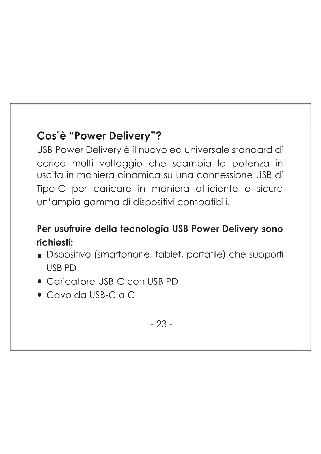 Specificazioni- 23 - Cos’è “Power Delivery”? USB Power Delivery è il nuovo ed universale standard di carica multi voltaggio che scambia la potenza in uscita in maniera dinamica su una connessione USB di Tipo-C per caricare in maniera efficiente e sicura un’ampia gamma di dispositivi compatibili. Per usufruire della tecnologia USB Power Delivery sono richiesti: Dispositivo (smartphone, tablet, portatile) che supporti USB PD Caricatore USB-C con USB PD Cavo da USB-C a C