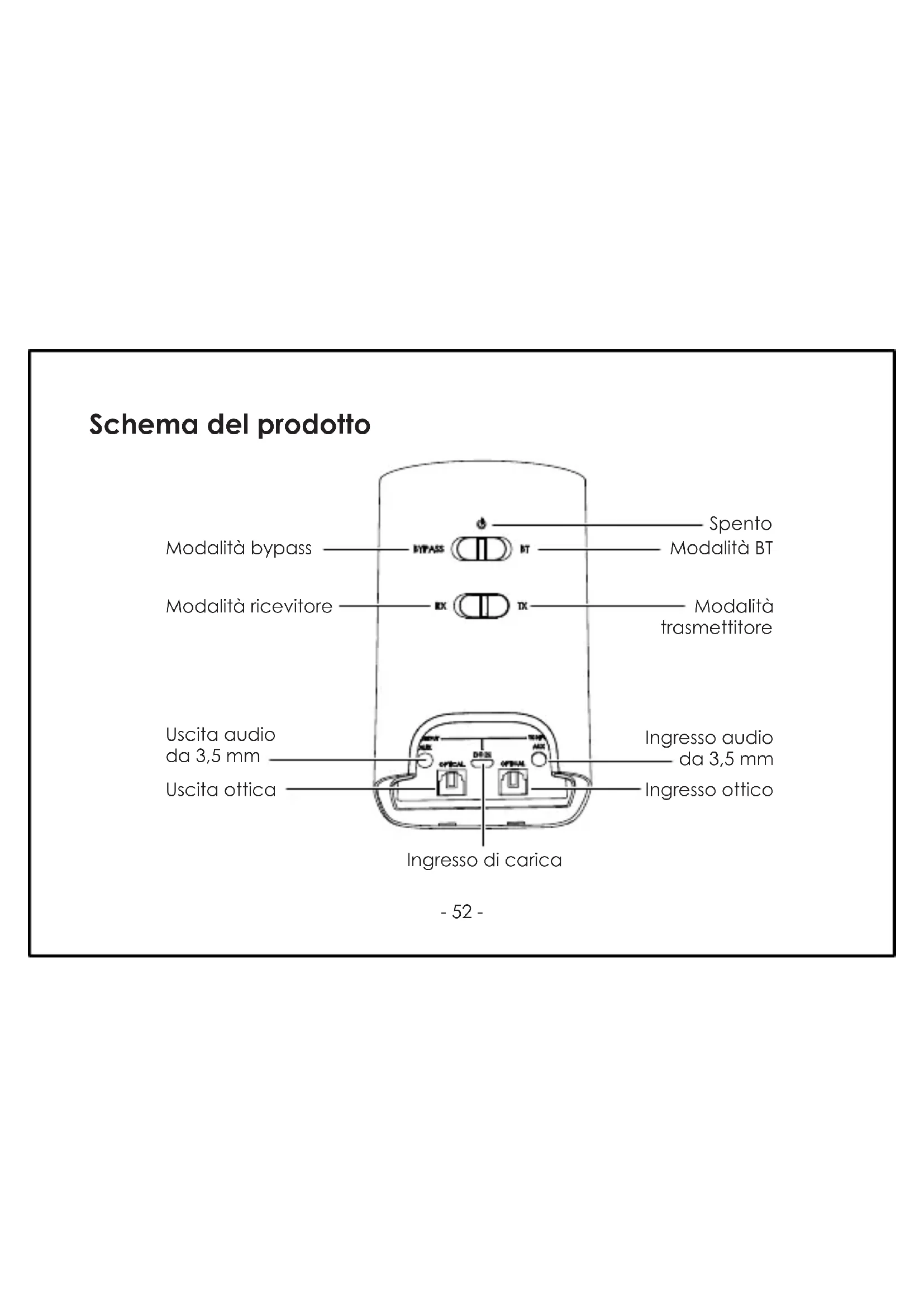 - Spostare l'interrutatore RX/TX su "TX". Poi spostare l'interrutatore Alimentazione/Modalità su "BT"
