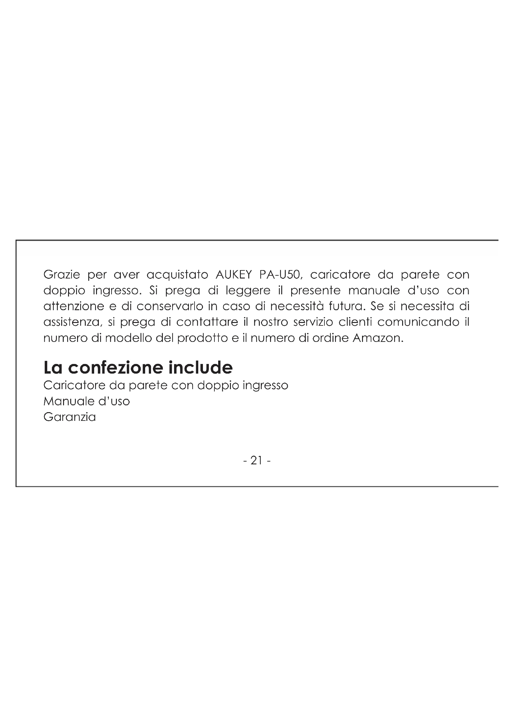 Grazie per aver acquistato AUKEY PA-U50, caricatore da parete con doppio ingresso. Si prega di leggere il presente manuale d'uso con attenzione e di conservarlo in caso di necessità futura. Se si necessita di assistenza, si prega di contattare il nostro servizio clienti comunicando il numero di modello del prodotto e il numero di ordine Amazon.