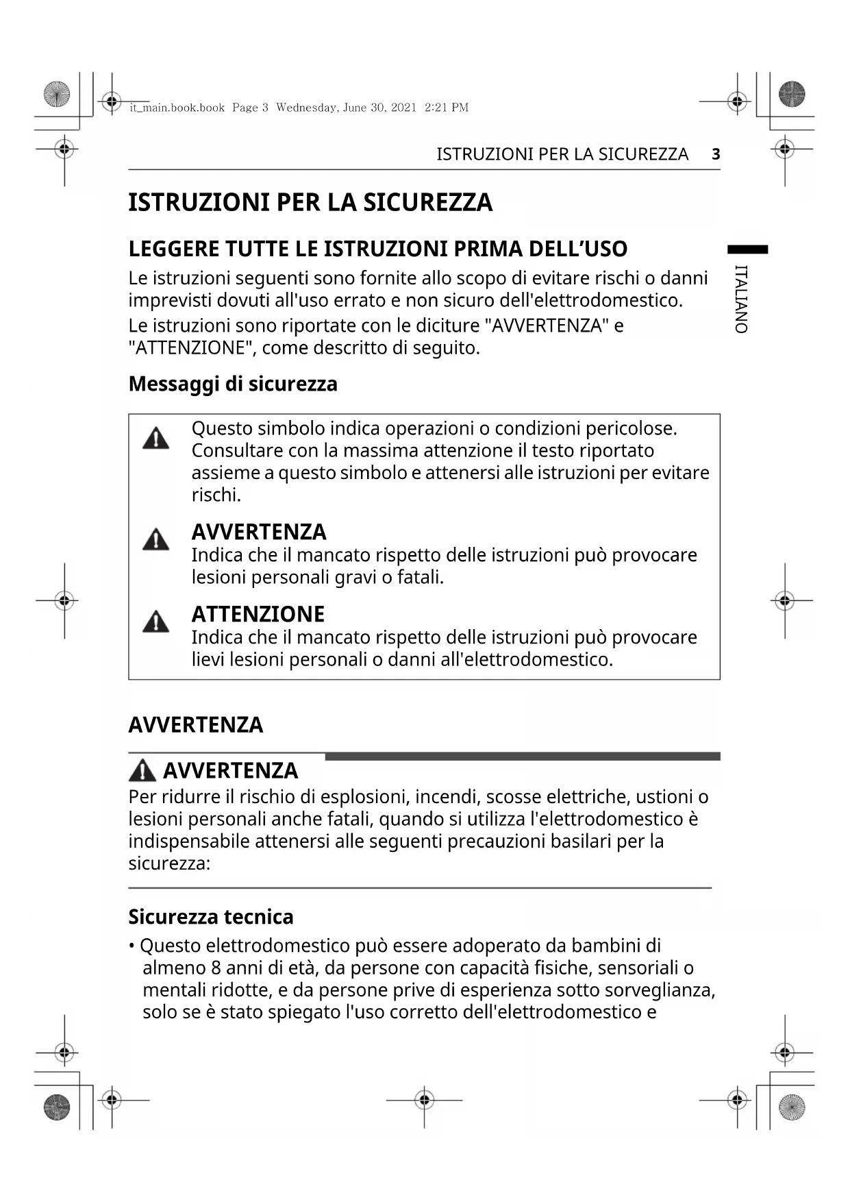 Per ridurre il rischio di esplosioni, incendi, scosse elettriche, ustioni o lesioni personali sono fallati, quando si utilizza l'elettrodomestico è indispensable atteneri alle seguenti precauzioni basilari per la sicurezza: