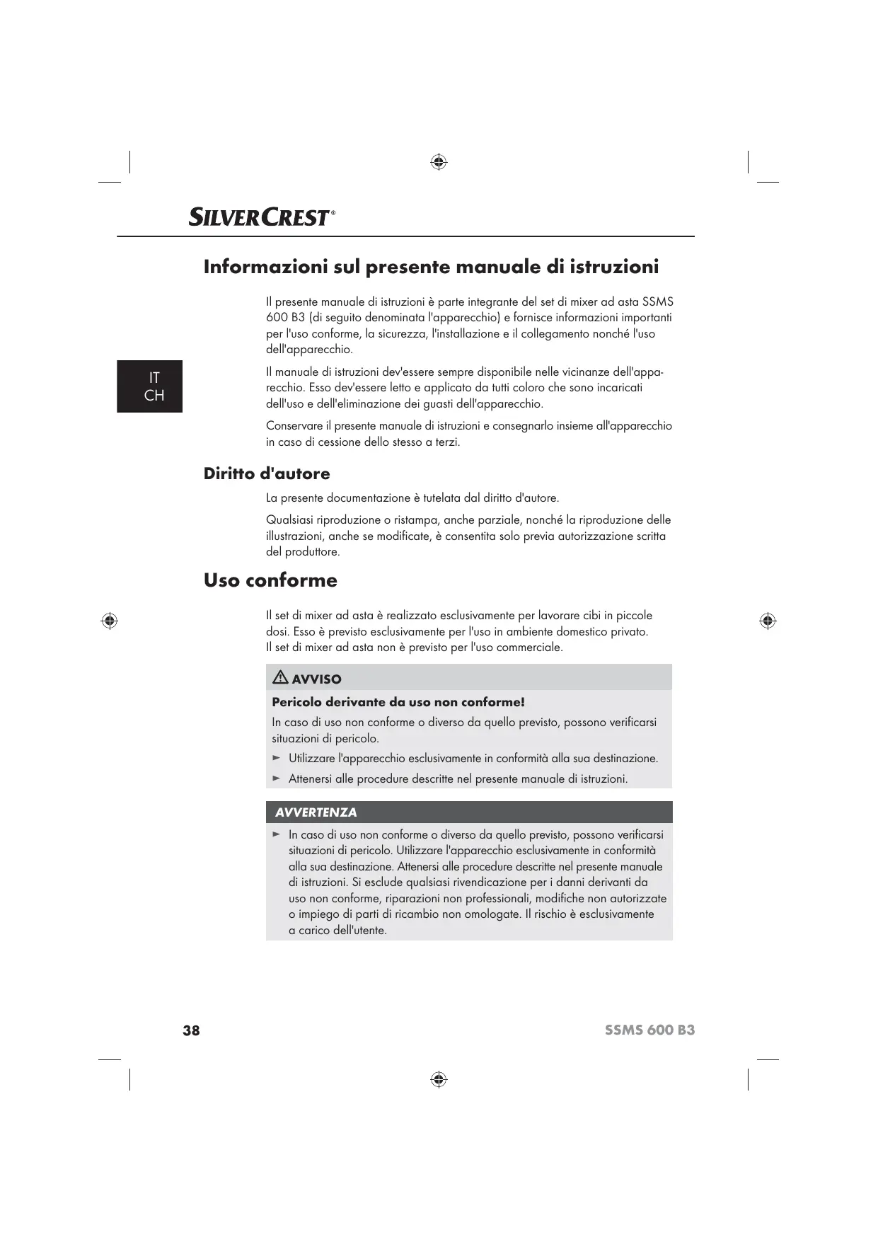 Informazioni sul presente manuale di istruzioni Il presente manuale di istruzioni è parte integrante del set di mixer ad asta SSMS 600 B3 (di seguito denominata l'apparecchio) e fornisce informazioni importanti per l'uso conforme, la sicurezza, l'installazione e il collegamento nonché l'uso dell'apparecchio. Il manuale di istruzioni dev'essere sempre disponibile nelle vicinanze dell'apparecchio. Esso dev'essere letto e applicato da tutti coloro che sono incaricati dell'uso e dell'eliminazione dei guasti dell'apparecchio.