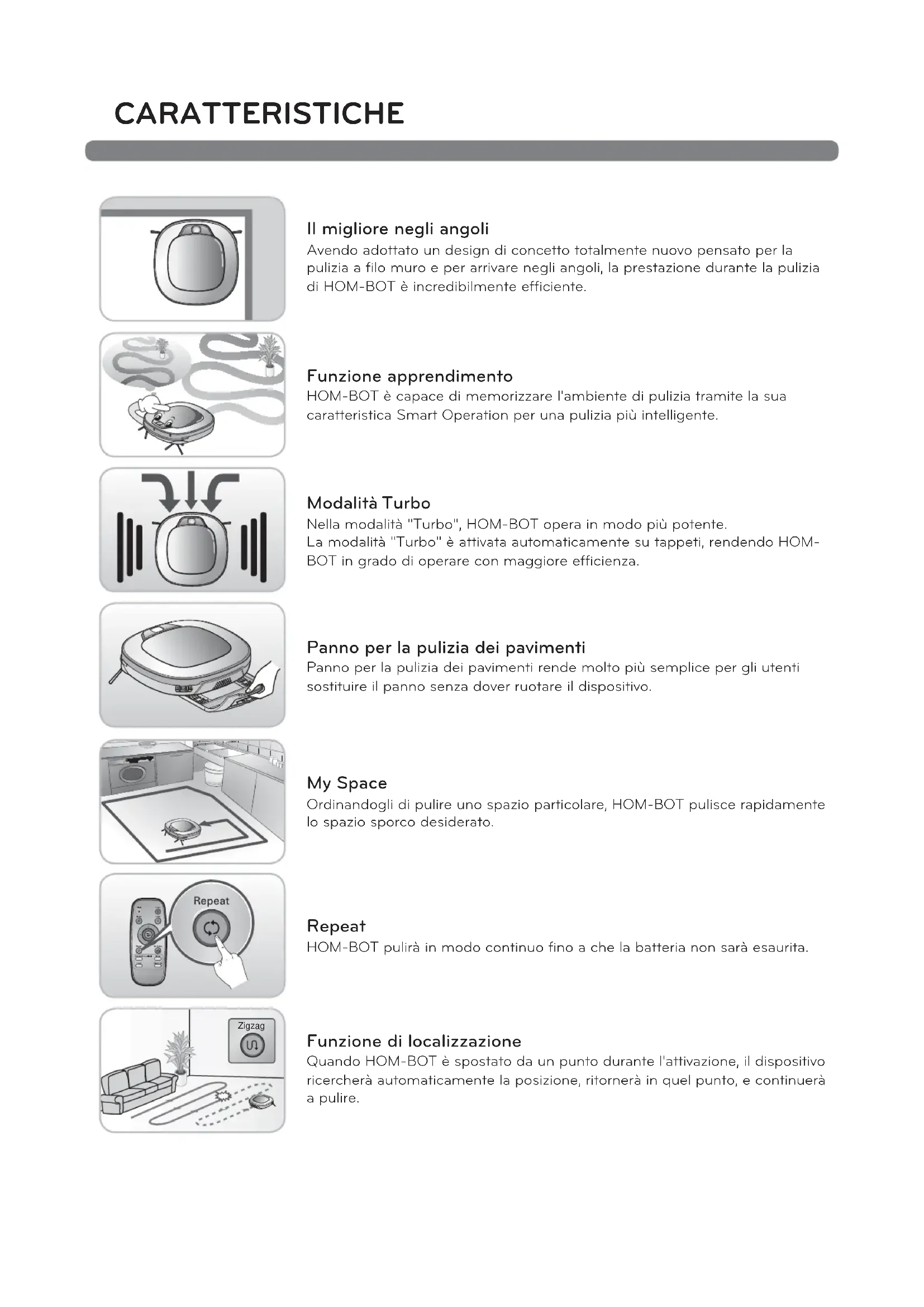 - Conserver hors de la portée des enfants, nourrissons ou animaux.CARATTERISTICHE Il migliore negli angoli Avendo adottato un design di concetto totalmente nuovo pensato per la pulizia a filo muro e per arrivare negli angoli, la prestazione durante la pulizia di HOM-BOT è incredibilmente efficiente. Funzione apprendimento HOM-BOT è capace di memorizzare l'ambiente di pulizia tramite la sua caratteristica Smart Operation per una pulizia più intelligente. Modalità Turbo Nella modalità "Turbo", HOM-BOT opera in modo più potente. La modalità "Turbo" è attivata automaticamente su tappeti, rendendo HOM- BOT in grado di operare con maggiore efficienza. Panno per la pulizia dei pavimenti Panno per la pulizia dei pavimenti rende molto più semplice per gli utenti sostituire il panno senza dover ruotare il dispositivo. My Space Ordinandogli di pulire uno spazio particolare, HOM-BOT pulisce rapidamente lo spazio sporco desiderato. Repeat HOM-BOT pulirà in modo continuo fino a che la batteria non sarà esaurita. Funzione di localizzazione Quando HOM-BOT è spostato da un punto durante l'attivazione, il dispositivo ricercherà automaticamente la posizione, ritornerà in quel punto, e continuerà a pulire. ZigzagCONTENUTI Precauzioni di sicurezza Incluso con il prodotto Descrizione delle parti Funzioni dei tasti Visualizzare informazioni sullo status Prima di iniziare Panoramica