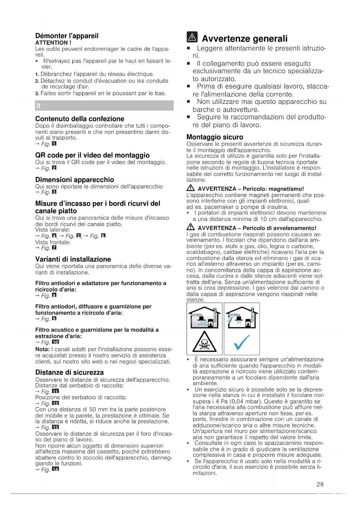 Avvertenze generali ¡ Leggere attentamente le presenti istruzio- ni. ¡ Il collegamento può essere eseguito esclusivamente da un tecnico specializza- to autorizzato. ¡ Prima di eseguire qualsiasi lavoro, stacca- re l'alimentazione della corrente. ¡ Non utilizzare mai questo apparecchio su barche o autovetture. ¡ Seguire le raccomandazioni del produtto- re del piano di lavoro. Montaggio sicuro Osservare le presenti avvertenze di sicurezza duran- te il montaggio dell'apparecchio. La sicurezza di utilizzo è garantita solo per l'installa- zione secondo le regole di buona tecnica riportate nelle istruzioni di montaggio. L'installatore è respon- sabile del corretto funzionamento nel luogo di instal- lazione. AVVERTENZA‒Pericolo: magnetismo! L'apparecchio contiene magneti permanenti che pos- sono interferire con gli impianti elettronici, quali ades. pacemaker o pompe di insulina. ▶ I portatori di impianti elettronici devono mantenersi a una distanza minima di 10cm dall'apparecchio. AVVERTENZA‒Pericolo di avvelenamento! I gas di combustione riaspirati possono causare av- velenamento. I focolari che dipendono dall'aria am- biente (per es. stufe a gas, olio, legna o carbone, scaldabagno, caldaie elettriche) ricavano l'aria per la combustione dalla stanza ed eliminano i gas di sca- rico all'esterno attraverso un impianto (per es. cami- no). In concomitanza della cappa di aspirazione ac- cesa, dalla cucina e dalle stanze adiacenti viene sot- tratta dell'aria. Senza un'alimentazione sufficiente di aria si crea depressione. I gas velenosi dal camino o dalla cappa di aspirazione vengono riaspirati nelle stanze. ▶ È necessario assicurare sempre un'alimentazione di aria sufficiente quando l'apparecchio in modali- tà aspirazione a ricircolo viene utilizzato contem- poraneamente a un focolare dipendente dall'aria ambiente. ▶ Un esercizio sicuro è possibile solo se la depres- sione nella stanza in cui è installato il focolare non supera i 4 Pa (0,04 mbar). Questo è garantito se l'aria necessaria alla combustione può affluire nel- la stanza attraverso aperture non fisse, per es. porte, finestre in combinazione con un canale di adduzione/scarico aria o altre misure tecniche. Un'apertura nel muro per alimentazione/scarico aria non garantisce il rispetto del valore limite. ▶ Consultate in ogni caso lo spazzacamino respon- sabile che è in grado di giudicare la ventilazione complessiva in casa e proporre misure adeguate. ▶ Se l'apparecchio è usato solo nella modalità a ri- circolo d'aria, il suo esercizio è possibile senza li- mitazioni.30 AVVERTENZA‒Pericolo di incendio! I depositi di grasso presenti nel filtro per grassi pos- sono incendiarsi. ▶ Nelle vicinanze dell'apparecchio non lavorare mai con fiamme libere (ad es. fiammeggiare). ▶ L’installazione dell’apparecchio nelle vicinanze di un focolare per combustibili solidi (ad es. legno o carbone) è consentita solo se questo è dotato di copertura chiusa e non estraibile. Non deve esser- ci produzione di scintille. AVVERTENZA‒Pericolo di lesioni! Modifiche all'impianto elettrico o meccanico sono pericolose e possono causare anomalie nel funzio- namento. ▶ Non apportare modifiche all'impianto elettrico o meccanico. Le parti che restano scoperte durante il montaggio possono essere appuntite e causare ferite da taglio. ▶ Indossare guanti protettivi. L'apparecchio è pesante. ▶ Per spostarlo occorrono 2 persone. ▶ Utilizzare esclusivamente ausili adeguati. AVVERTENZA‒Pericolo di soffocamento! I bambini potrebbero mettersi in testa il materiale di imballaggio o avvolgersi nello stesso, rimanendo sof- focati. ▶ Tenere lontano il materiale di imballaggio dai bambini. ▶ Vietare ai bambini di giocare con materiali d’im- ballaggio. AVVERTENZA‒Pericolo di avvelenamento! I gas di combustione riaspirati possono causare av- velenamento. ▶ Non far convogliare l'aria esausta in un camino per fumo o per gas di scarico funzionanti. ▶ L’aria esausta non deve essere convogliata in un pozzo di aerazione dei locali di installazione di fo- colari. ▶ Se l’aria esausta viene immessa in un camino per fumo o gas di scarico non in funzione, è necessa- rio ottenere l’autorizzazione di uno spazzacamino specializzato. I gas di combustione riaspirati possono causare av- velenamento. ▶ Installando una cappa di aspirazione con un foco- lare dipendente dall'aria ambiente, l'alimentazione della cappa di aspirazione deve essere provvista di un adeguato comando di sicurezza. Avvertenze sul collegamento elettrico Per eseguire il collegamento elettrico dell'apparec- chio in sicurezza, osservare le presenti avvertenze. AVVERTENZA‒Pericolo di scosse elettriche! Si deve poter sempre staccare l'apparecchio dalla rete elettrica. L'apparecchio può essere collegato so- lamente a una presa di collegamento installata se- condo le istruzioni. ▶ Durante la posa fissa dell'installazione elettrica de- ve essere montato un dispositivo di separazione su tutti i poli conforme alle condizioni della cate- goria di sovratensione III e alle disposizioni dell'al- lestimento. ▶ Soltanto un elettricista appositamente formato può eseguire la posa fissa dell'installazione elettrica. Noi consigliamo di installare un interruttore diffe- renziale (differenziale) nel circuito elettrico dell'ali- mentazione dell'apparecchio. ¡ Non piegare o schiacciare il cavo di collegamento e tenerlo lontano da bordi taglienti. ¡ Posare il cavo di collegamento in modo tale che non tocchi l'alloggiamento dell'apparecchio caldo. ¡ Utilizzare esclusivamente il cavo di collegamento fornito in dotazione insieme all'apparecchio o con- segnato dal servizio di assistenza tecnica. ¡ Questo apparecchio è conforme ai requisiti di pro- tezione RFI dell’Unione Europea. ¡ L'apparecchio appartiene alla classe di protezione 1 e deve essere utilizzato solo se dotato di un conduttore di terra. ¡ Il costruttore non si assume alcuna responsabilità per eventuali guasti o 