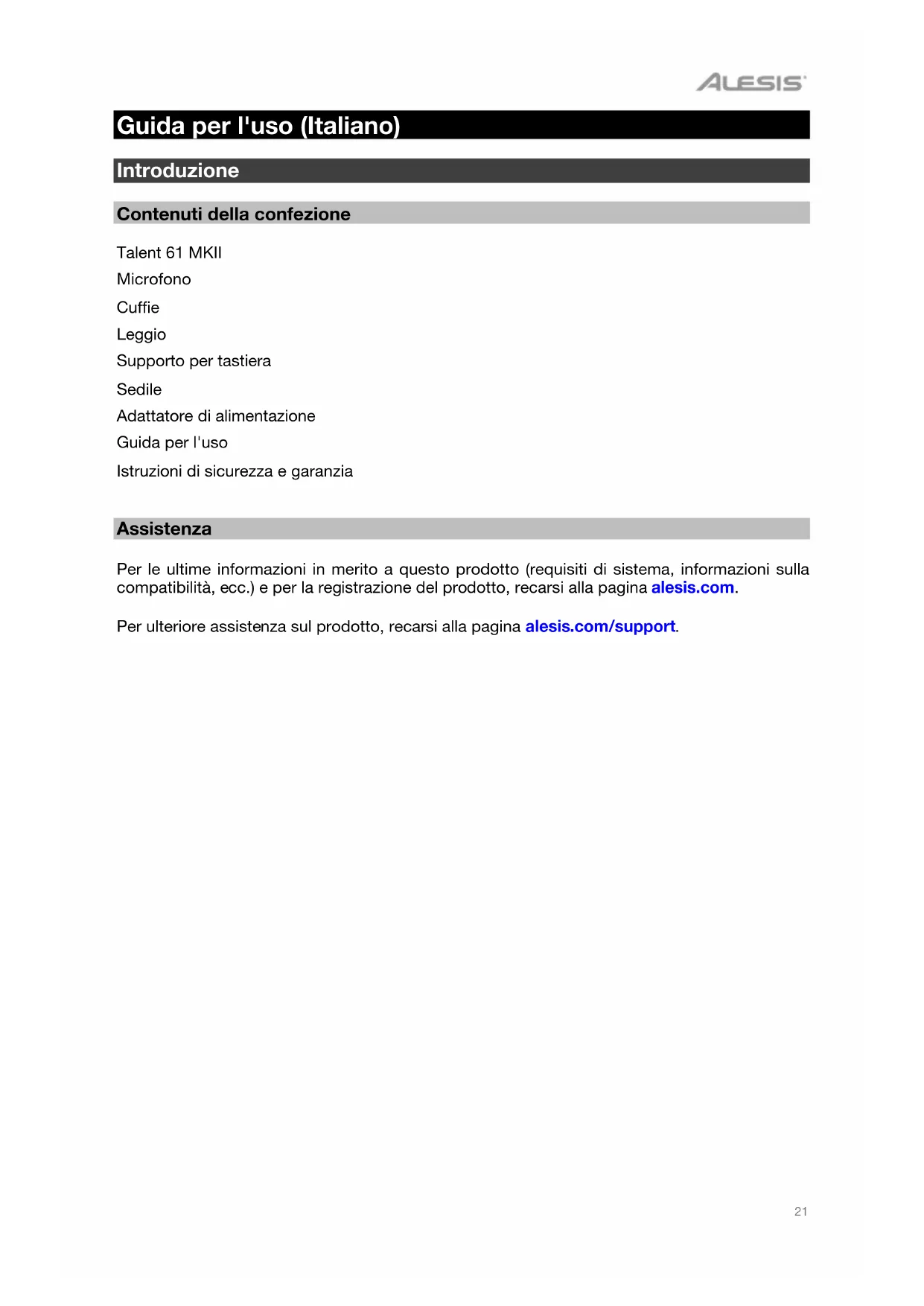 Guida per l'uso (Italiano) Introduzione Contenuti della confezione Talent 61 MKII Microfono Cuffie Leggio Supporto per tastiera Sedile Adattatore di alimentazione Guida per l'uso Istruzioni di sicurezza e garanzia