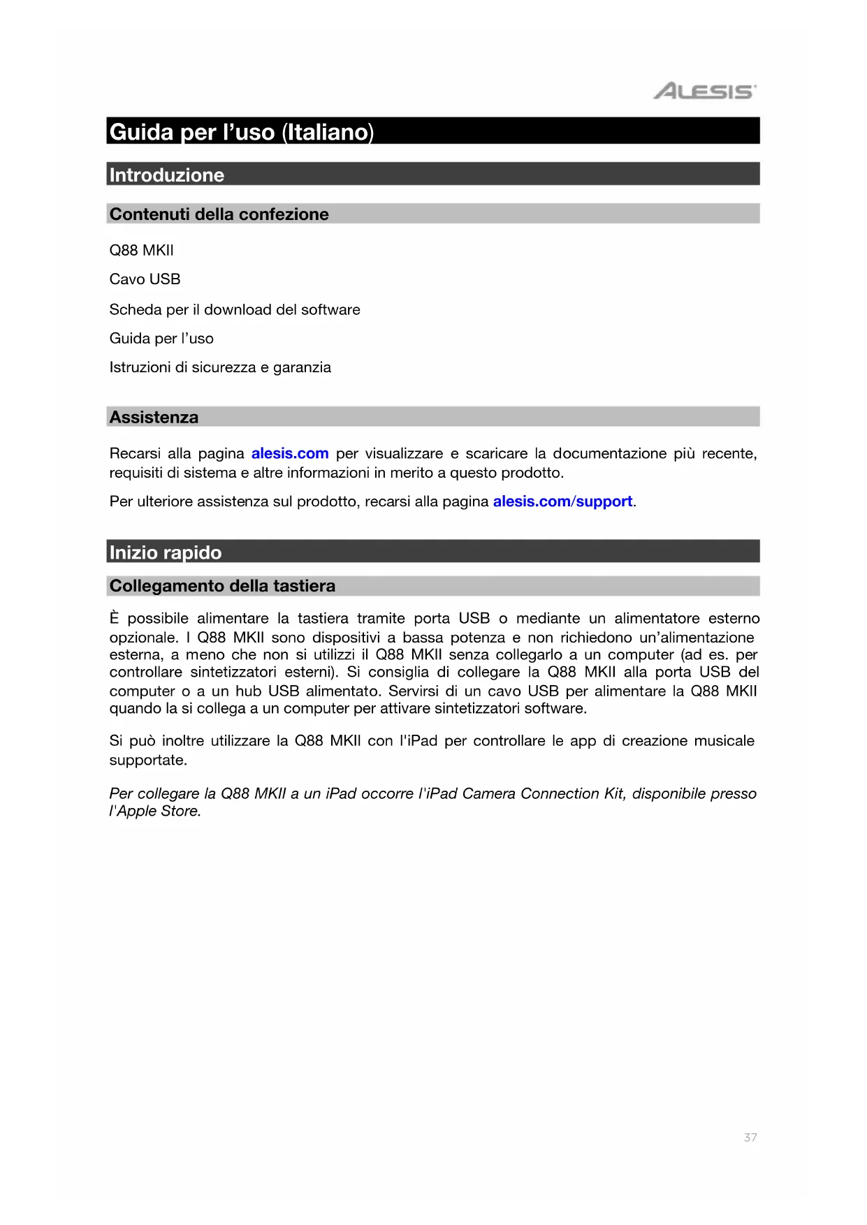 sortie MIDI (MIDI Out) en direction de n’importe quel périphérique qui y serait connecté. Vous devez sélectionner la sortie USB MIDI de votre Q88 MKII en tant que dispositif de sortie MIDI dans votre séquenceur pour utiliser la sortie MIDI.37 Guida per l’uso (Italiano) Introduzione Contenuti della confezione Q88 MKII Cavo USB Scheda per il download del software Guida per l’uso Istruzioni di sicurezza e garanzia Assistenza Recarsi alla pagina alesis.com per visualizzare e scaricare la documentazione più recente, requisiti di sistema e altre informazioni in merito a questo prodotto. Per ulteriore assistenza sul prodotto, recarsi alla pagina alesis.com/support. Inizio rapido Collegamento della tastiera È possibile alimentare la tastiera tramite porta USB o mediante un alimentatore esterno opzionale. I Q88 MKII sono dispositivi a bassa potenza e non richiedono un’alimentazione esterna, a meno che non si utilizzi il Q88 MKII senza collegarlo a un computer (ad es. per controllare sintetizzatori esterni). Si consiglia di collegare la Q88 MKII alla porta USB del computer o a un hub USB alimentato. Servirsi di un cavo USB per alimentare la Q88 MKII quando la si collega a un computer per attivare sintetizzatori software.