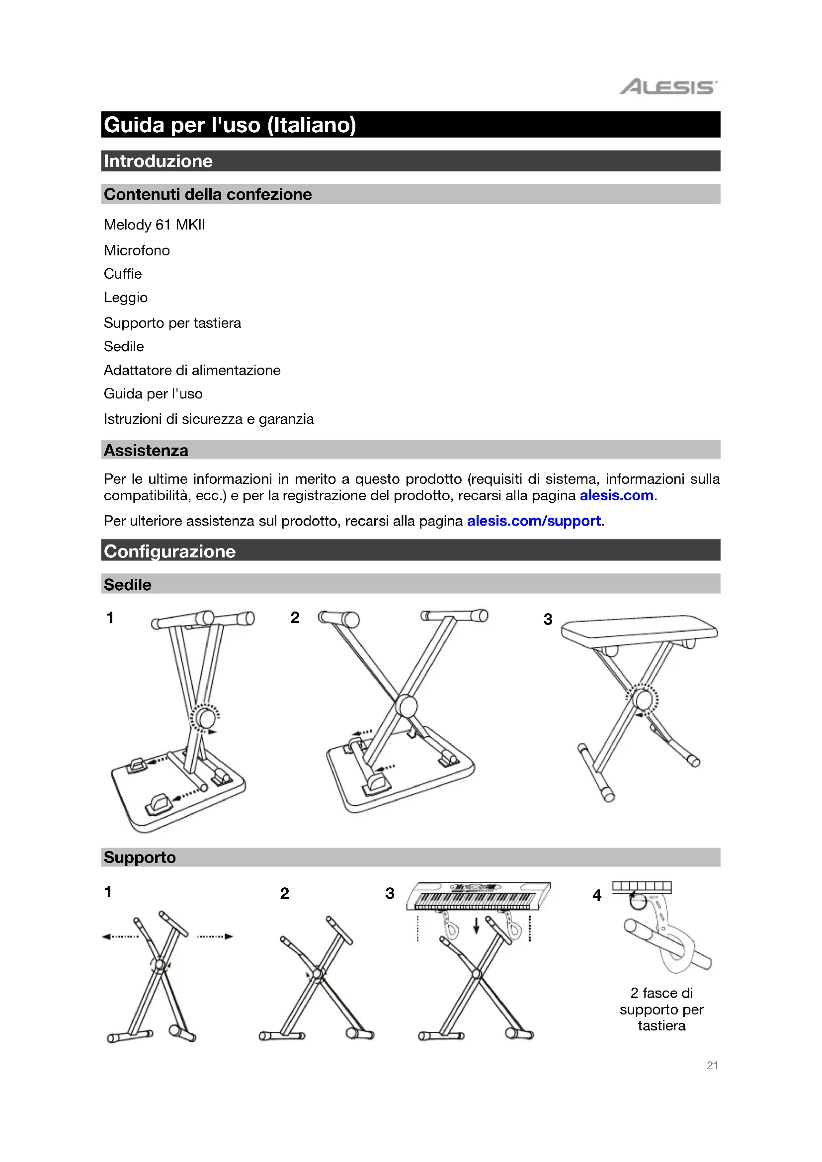 Guida per l'uso (Italiano) Introduzione Contenuti della confezione Melody 61 MKII Microfono Cuffie Leggio Supporto per tastiera Sedile Adattatore di alimentazione Guida per l'uso Istruzioni di sicurezza e garanzia Assistenza Per le ultime informazioni in merito a questo prodotto (requisiti di sistema, informazioni sulla compatibilità, ecc.) e per la registrazione del prodotto, recarsi alla pagina alesis.com. Per ulteriore assistenza sul prodotto, recarsi alla pagina alesis.com/support. Configurazione Sedile