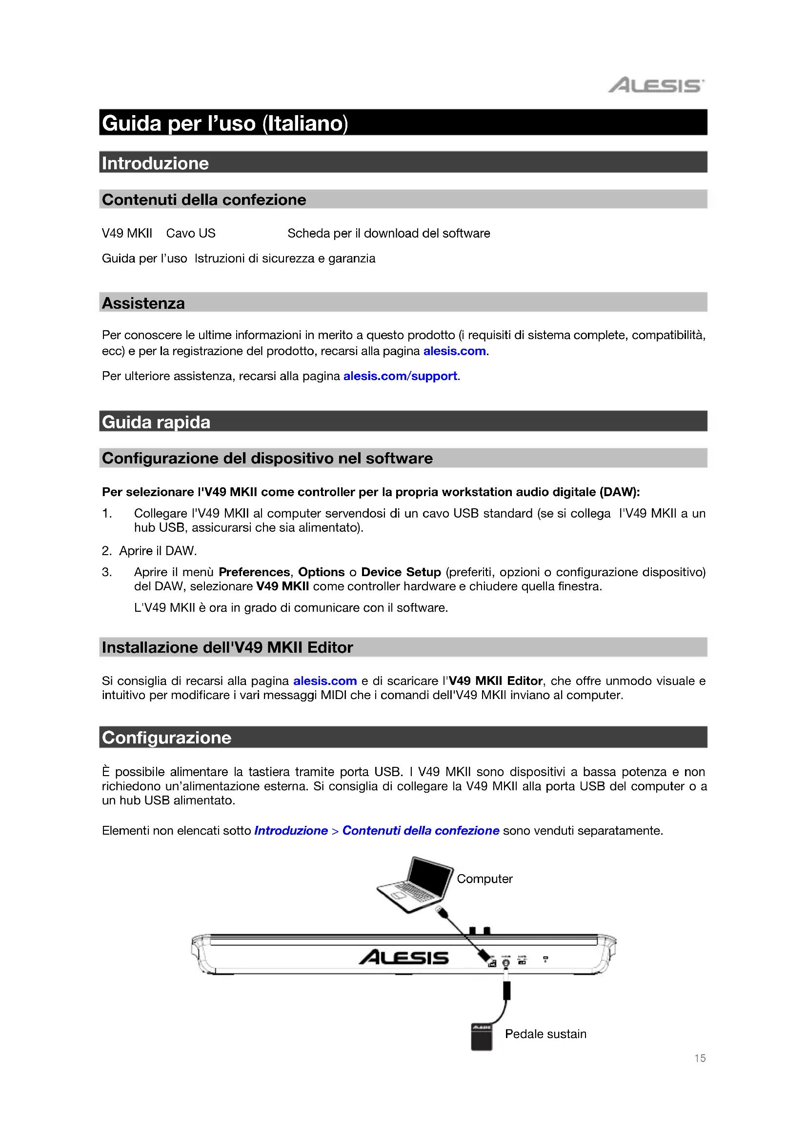 : Ce connecteur est compatible avec les câbles de sécurité Kensington standard pour ordinateur portable pour la protection contre le vol.15 Guida per l’uso (Italiano) Introduzione Contenuti della confezione V49 MKII Cavo US Scheda per il download del software Guida per l’uso Istruzioni di sicurezza e garanzia Assistenza Per conoscere le ultime informazioni in merito a questo prodotto (i requisiti di sistema complete, compatibilità, ecc) e per la registrazione del prodotto, recarsi alla pagina alesis.com. Per ulteriore assistenza, recarsi alla pagina alesis.com/support. Guida rapida Configurazione del dispositivo nel software Per selezionare l'V49 MKII come controller per la propria workstation audio digitale (DAW):