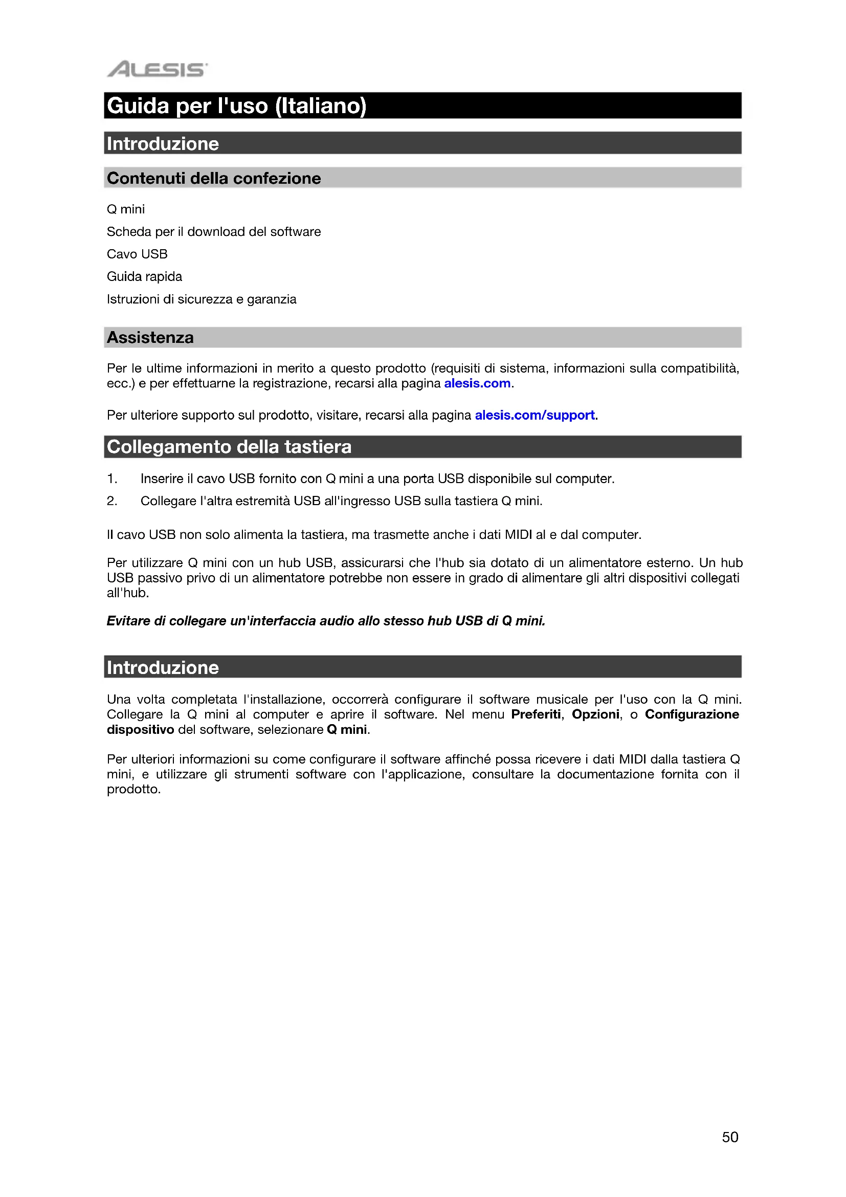 Scarica le istruzioni per il tuo Attrezzatura DJ in formato PDF gratuitamente! Trova il tuo manuale Q Mini - ALESIS e riprendi in mano il tuo dispositivo elettronico. In questa pagina sono pubblicati tutti i documenti necessari per l'utilizzo del tuo dispositivo. Q Mini del marchio ALESIS.