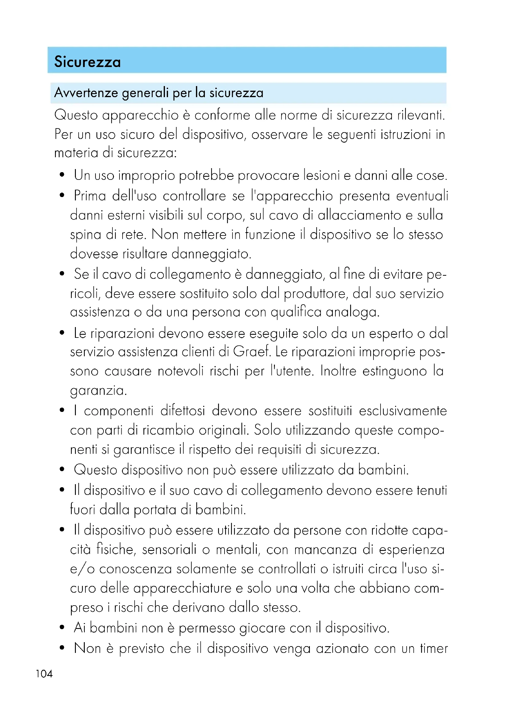 - In questo caso, prima di continuare ad utilizzare il dispositi-106 vo, fare installare un nuovo cavo di alimentazione dal servizio clienti Graef oppure da un esperto autorizzato.