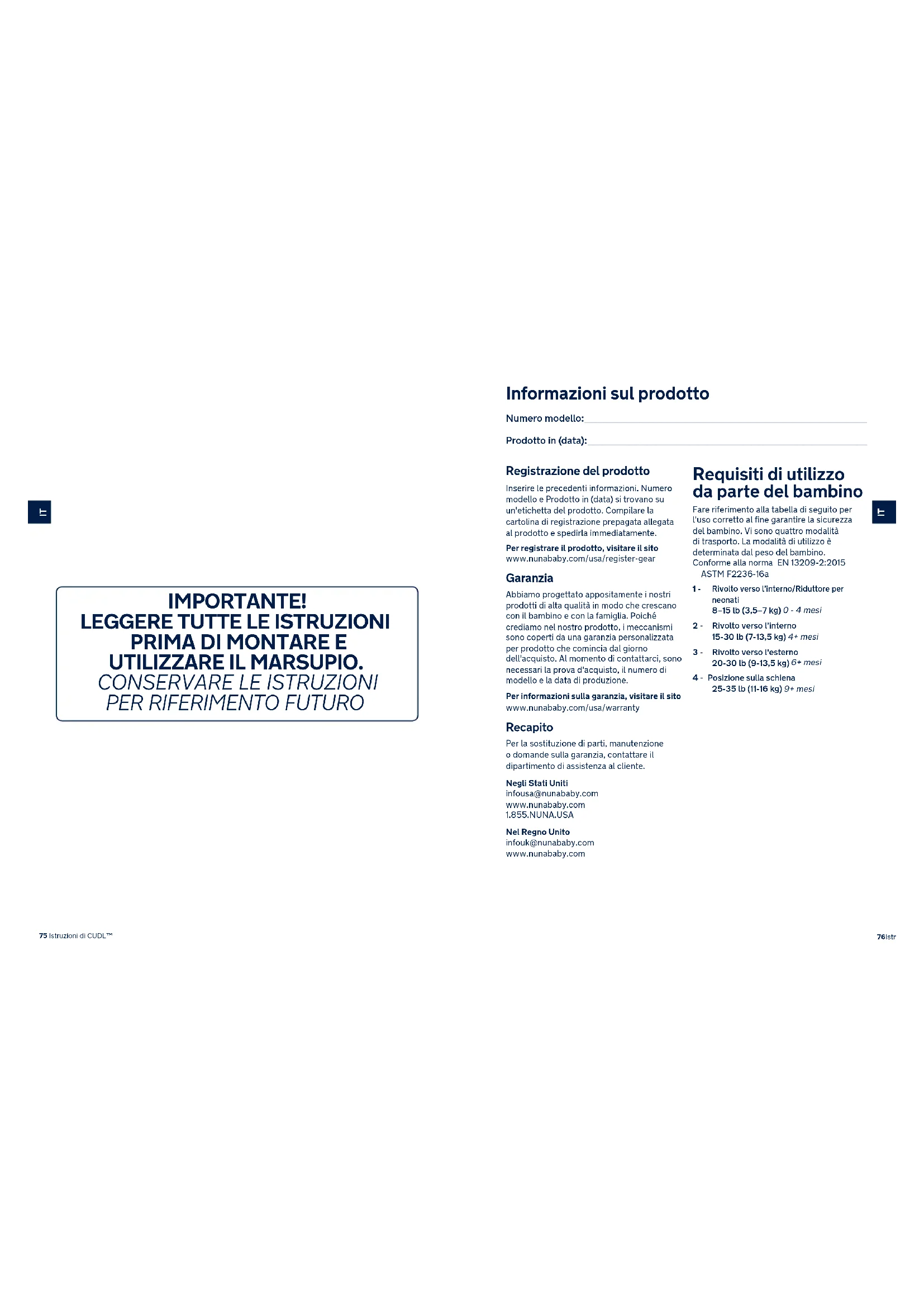 Informazioni sul prodotto Numero modello: ____________________________________________________________________________________________________________________________________________ Prodotto in (data): _________________________________________________________________________________________________________________________________________ Registrazione del prodotto Inserire le precedenti informazioni. Numero modello e Prodotto in (data) si trovano su un'etichetta del prodotto. Compilare la cartolina di registrazione prepagata allegata al prodotto e spedirla immediatamente.Per registrare il prodotto, visitare il sito www.nunababy.com/usa/register-gear Garanzia Abbiamo progettato appositamente i nostri prodotti di alta qualità in modo che crescano con il bambino e con la famiglia. Poiché crediamo nel nostro prodotto, i meccanismi sono coperti da una garanzia personalizzata per prodotto che comincia dal giorno dell'acquisto. Al momento di contattarci, sono necessari la prova d'acquisto, il numero di modello e la data di produzione.Per informazioni sulla garanzia, visitare il sito www.nunababy.com/usa/warranty Recapito Per la sostituzione di parti, manutenzione o domande sulla garanzia, contattare il dipartimento di assistenza al cliente.Negli Stati Uniti infousa@nunababy.com www.nunababy.com 1.855.NUNA.USANel Regno Unito infouk@nunababy.com www.nunababy.com Requisiti di utilizzo da parte del bambino Fare riferimento alla tabella di seguito per l'uso corretto al fine garantire la sicurezza del bambino. Vi sono quattro modalità di trasporto. La modalità di utilizzo è determinata dal peso del bambino. Conforme alla norma EN 13209-2:2015 ASTM F2236-16a1 - Rivolto verso l’interno/Riduttore per neonati 8–15 lb (3,5–7 kg) 0 - 4 mesi