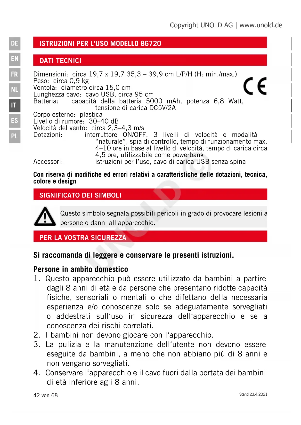 Questo simbolo segnala possibili pericoli in grado di provocare lesioni a persone o danni all‘apparecchio. Dimensioni: circa 19,7 x 19,7 35,3 – 39,9 cm L/P/H (H: min./max.) Peso: circa 0,9 kg Ventola: diametro circa 15,0 cm Lunghezza cavo: cavo USB, circa 95 cm Batteria: capacità della batteria 5000 mAh, potenza 6,8 Watt, tensione di carica DC5V/2A Corpo esterno: plastica Livello di rumore: 30–40 dB Velocità del vento: circa 2,3–4,3 m/s Dotazioni: interruttore ON/OFF, 3 livelli di velocità e modalità “naturale”, spia di controllo, tempo di funzionamento max. 4–10 ore in base al livello di velocità, tempo di carica circa 4,5 ore, utilizzabile come powerbank Accessori: istruzioni per l’uso, cavo di carica USB senza spina Con riserva di modifiche ed errori relativi a caratteristiche delle dotazioni, tecnica, colore e design Copyright UNOLD AG | www.unold.de UNOLD ©Stand 23.4.2021 43 von 68