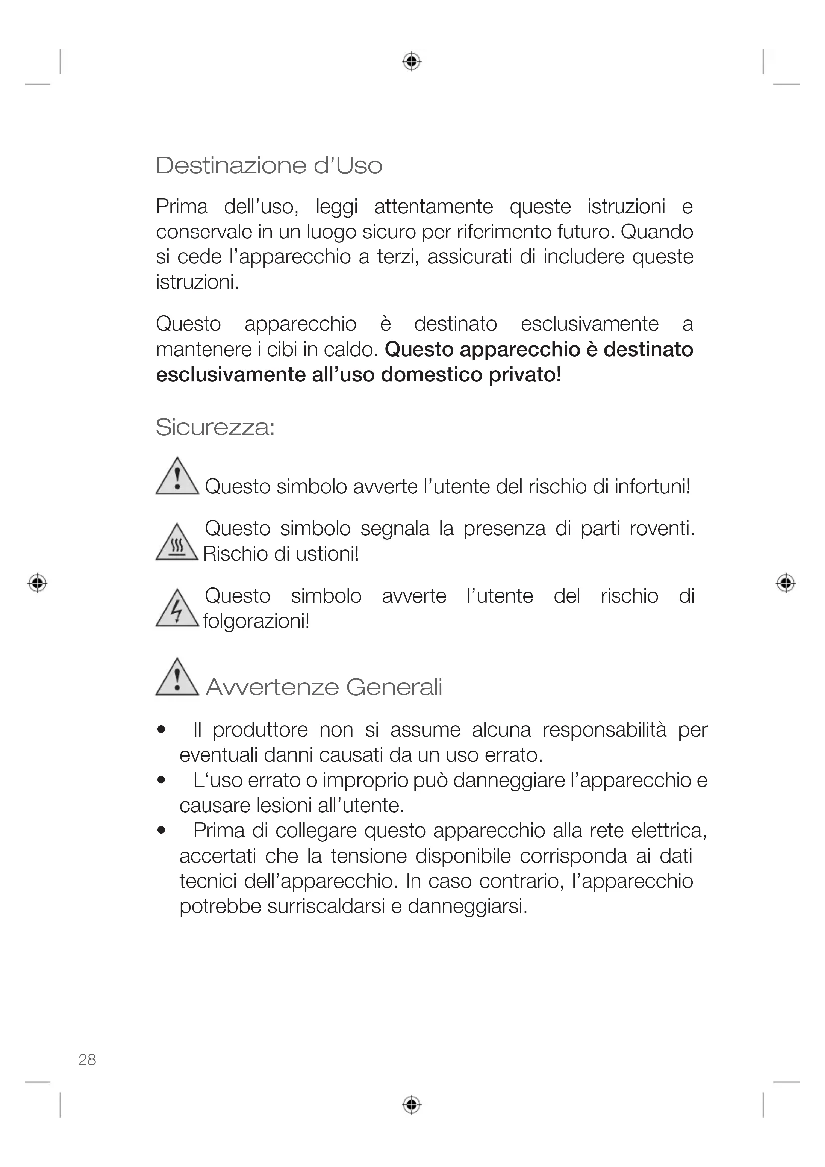 - Al termine del processo di riscaldamento, la spia rossa (4) si spegne e la spia verde (5) si accende. - Colloca gli utensili da cucina con gli alimenti da mantenere in caldo sulla piastra riscaldata (2). La piastra potrebbe graffiarsi a seconda degli utensili da cucina utilizzati. Si consiglia di utilizzare solo utensili da cucina resistenti al calore. Una volta che la piastra si sia riscaldata, potrà essere utilizzata anche senza il cavo di alimentazione (cordless). La piastra resterà calda per circa 60 minuti. Al termine di ogni sessione d’uso, accertati sempre che l’apparecchio sia spento e la sua spina staccata dalla rete elettrica. Pulizia e Manutenzione Per motivi di igiene, pulisci regolarmente l’apparecchio, meglio se dopo ogni sessione. Non farlo potrebbe favorire il verificarsi di situazioni pericolose. Prima di procedere alla pulizia, spegni sempre l’apparecchio e staccane la spina. Lascia raffreddare completamente. Non immergere mai l’apparecchio nell’acqua. Pericolo! Scossa Elettrica! Pulisci l’apparecchio con un panno morbido inumidito e quindi asciugalo con cura. Non utilizzare detergenti aggressivi e/o altri oggetti duri per la pulizia dell’apparecchio. La pulizia e la manutenzione non devono essere effettuate da bambini senza supervisione. STOCCAGGIO Tieni l’apparecchio lontano dalla portata dei bambini e riponilo in un luogo pulito e asciutto. Istruzioni per lo smaltimento I dispositivi elettrici di scarto contrassegnati da questo simbolo non vanno smaltiti insieme ai rifiuti domestici, ma raccolti separatamente. Pertanto, alla fine del suo ciclo di servizio, questo dispositivo va consegnato ad un punto di raccolta differenziata o al tuo rivenditore locale. Il Piastra per Mantenere in Caldo 59500 è confezionato in una scatola per la vendita al dettaglio. Queste scatole sono riciclabili, ovvero possono essere riusate. DATI TECNICI: Voltaggio: 220 - 240 V ~ 50 - 60 Hz Alimentazione: 1100 W Classe di protezione: I I dati tecnici sono soggetti a modifiche.ITALIANO Manuale delle Istruzioni
