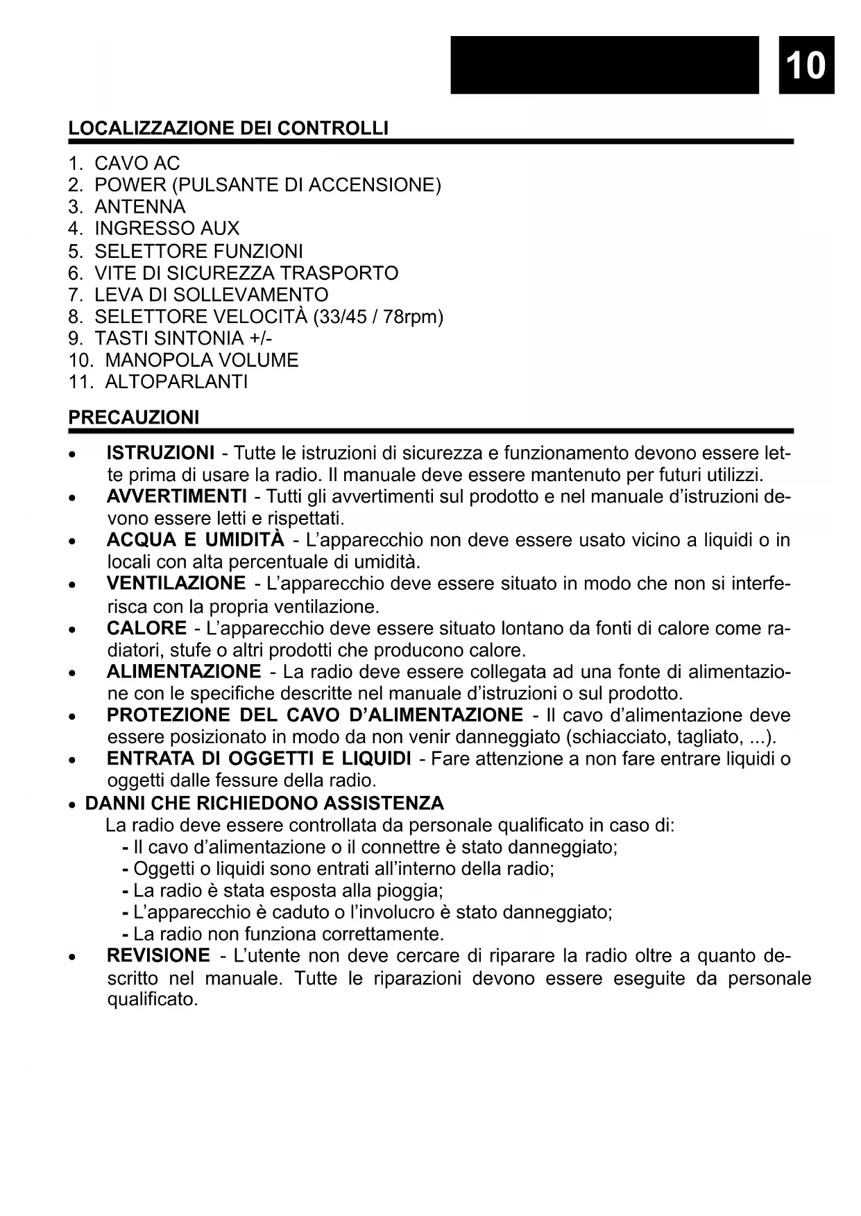 PRECAUZIONI ISTRUZIONI - Tutte le istruzioni di sicurezza e funzionamento devono essere let- te prima di usare la radio. Il manuale deve essere mantenuto per futuri utilizzi. AVVERTIMENTI - Tutti gli avvertimenti sul prodotto e nel manuale d’istruzioni de- vono essere letti e rispettati. ACQUA E UMIDITÀ - L’apparecchio non deve essere usato vicino a liquidi o in locali con alta percentuale di umidità. VENTILAZIONE - L’apparecchio deve essere situato in modo che non si interfe- risca con la propria ventilazione. CALORE - L’apparecchio deve essere situato lontano da fonti di calore come ra- diatori, stufe o altri prodotti che producono calore. ALIMENTAZIONE - La radio deve essere collegata ad una fonte di alimentazio- ne con le specifiche descritte nel manuale d’istruzioni o sul prodotto. PROTEZIONE DEL CAVO D’ALIMENTAZIONE - Il cavo d’alimentazione deve essere posizionato in modo da non venir danneggiato (schiacciato, tagliato, ...). ENTRATA DI OGGETTI E LIQUIDI - Fare attenzione a non fare entrare liquidi o oggetti dalle fessure della radio.