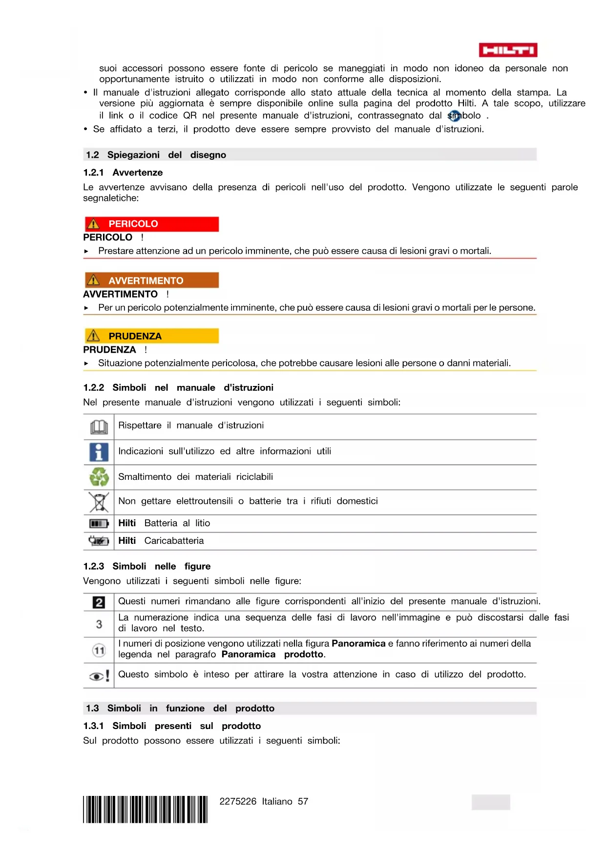Nel presente manuale d'istruzioni vengono utilizzati i seguenti simboli: Rispettare il manuale d'istruzioni Indicazioni sull'utilizzo ed altre informazioni utili Smaltimento dei materiali riciclabili Non gettare elettroutensili o batterie tra i rifiuti domestici Hilti Batteria al litio Hilti Caricabatteria