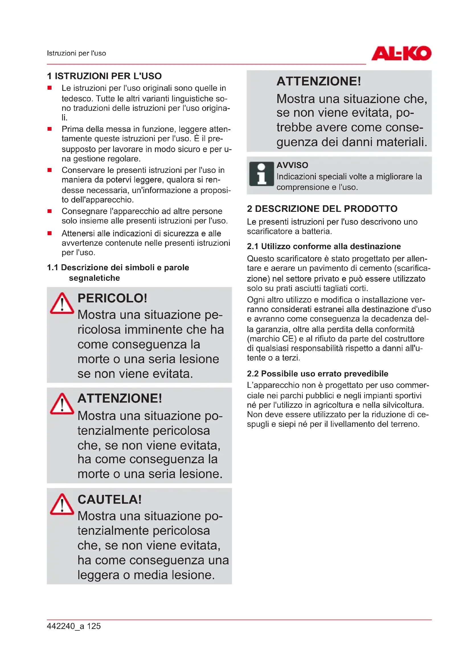 Questo scarificatore è stato progettato per allen- tare e aerare un pavimento di cemento (scarifica- zione) nel settore privato e può essere utilizzato solo su prati asciutti tagliati corti. Ogni altro utilizzo e modifica o installazione ver- ranno considerati estranei alla destinazione d'uso e avranno come conseguenza la decadenza del- la garanzia, oltre alla perdita della conformità (marchio CE) e al rifiuto da parte del costruttore di qualsiasi responsabilità rispetto a danni all'u- tente o a terzi.