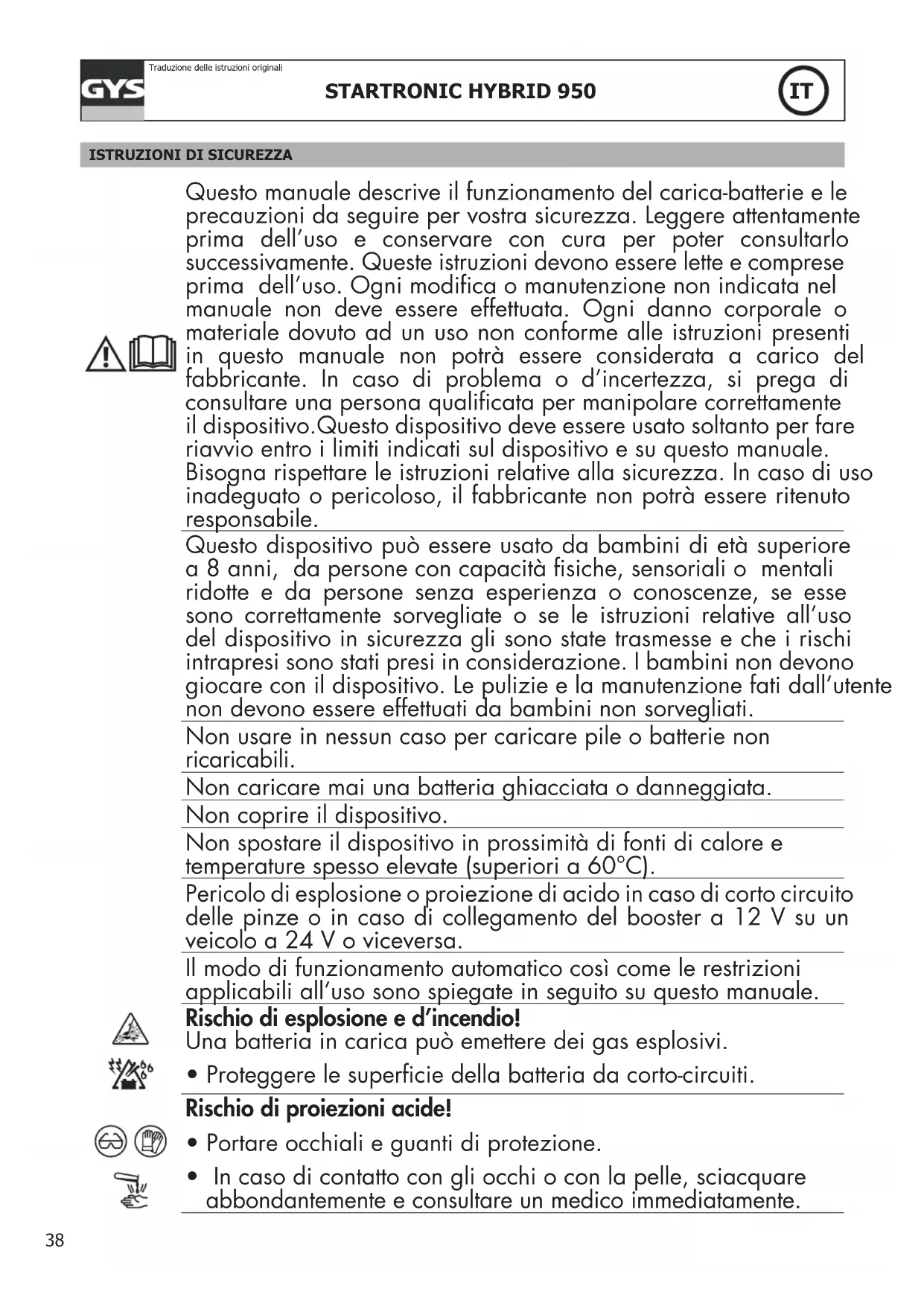 Questo manuale descrive il funzionamento del carica-batterie e le precauzioni da seguire per vostra sicurezza. Leggere attentamente prima dell’uso e conservare con cura per poter consultarlo successivamente. Queste istruzioni devono essere lette e comprese prima dell’uso. Ogni modica o manutenzione non indicata nel manuale non deve essere effettuata. Ogni danno corporale o materiale dovuto ad un uso non conforme alle istruzioni presenti in questo manuale non potrà essere considerata a carico del fabbricante. In caso di problema o d’incertezza, si prega di consultare una persona qualicata per manipolare correttamente il dispositivo.Questo dispositivo deve essere usato soltanto per fare riavvio entro i limiti indicati sul dispositivo e su questo manuale. Bisogna rispettare le istruzioni relative alla sicurezza. In caso di uso inadeguato o pericoloso, il fabbricante non potrà essere ritenuto responsabile. Questo dispositivo può essere usato da bambini di età superiore a 8 anni, da persone con capacità siche, sensoriali o mentali ridotte e da persone senza esperienza o conoscenze, se esse sono correttamente sorvegliate o se le istruzioni relative all’uso del dispositivo in sicurezza gli sono state trasmesse e che i rischi intrapresi sono stati presi in considerazione. I bambini non devono giocare con il dispositivo. Le pulizie e la manutenzione fati dall’utente non devono essere effettuati da bambini non sorvegliati. Non usare in nessun caso per caricare pile o batterie non ricaricabili. Non caricare mai una batteria ghiacciata o danneggiata. Non coprire il dispositivo. Non spostare il dispositivo in prossimità di fonti di calore e temperature spesso elevate (superiori a 60°C). Pericolo di esplosione o proiezione di acido in caso di corto circuito delle pinze o in caso di collegamento del booster a 12 V su un veicolo a 24 V o viceversa. Il modo di funzionamento automatico così come le restrizioni applicabili all’uso sono spiegate in seguito su questo manuale. Rischio di esplosione e d’incendio! Una batteria in carica può emettere dei gas esplosivi.