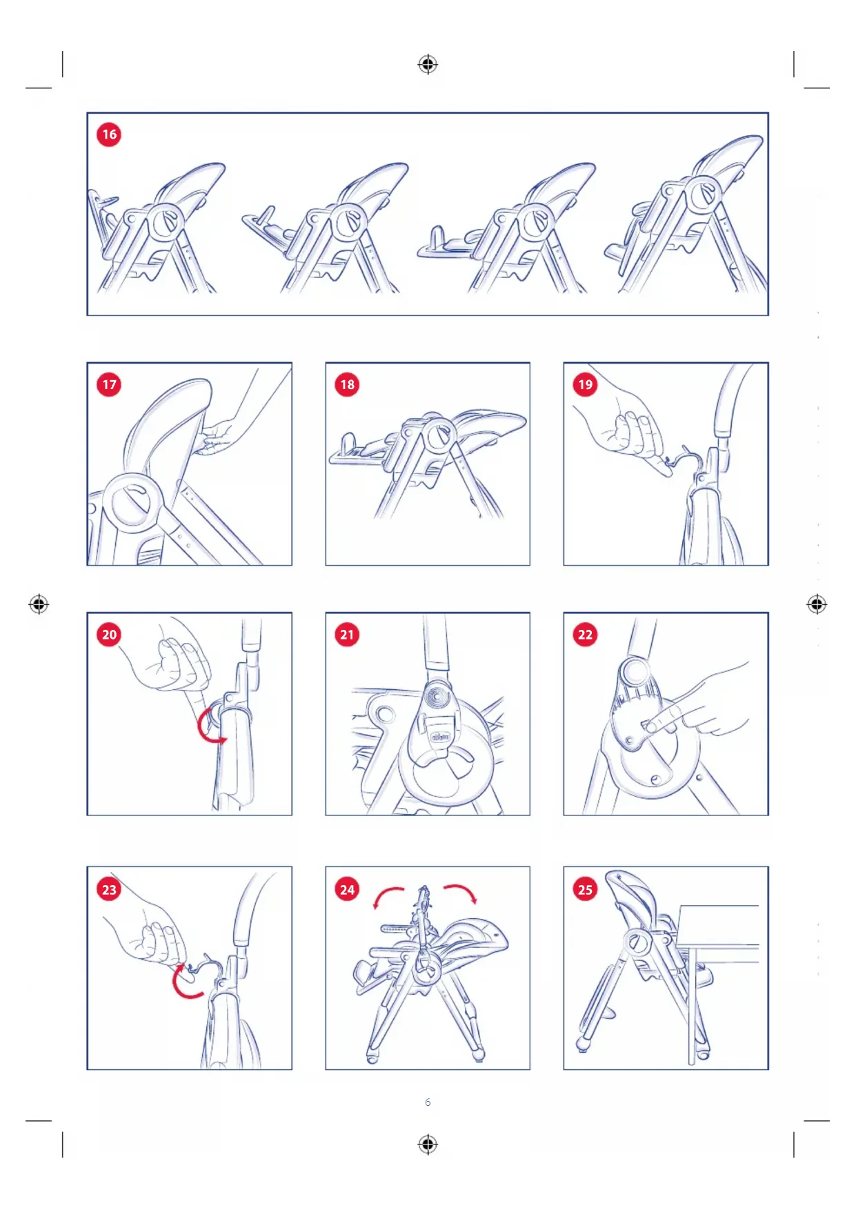 - Nelle operazioni di apertura e chiusura assicurarsi che il bambino sia a debita distanza. Nelle operazioni di regolazione (inclinazione dello schienale, posiziona- mento tavolozza) assicurarsi che le parti mobili del Seggiolone non vengano a contatto con il corpo del bambino.
