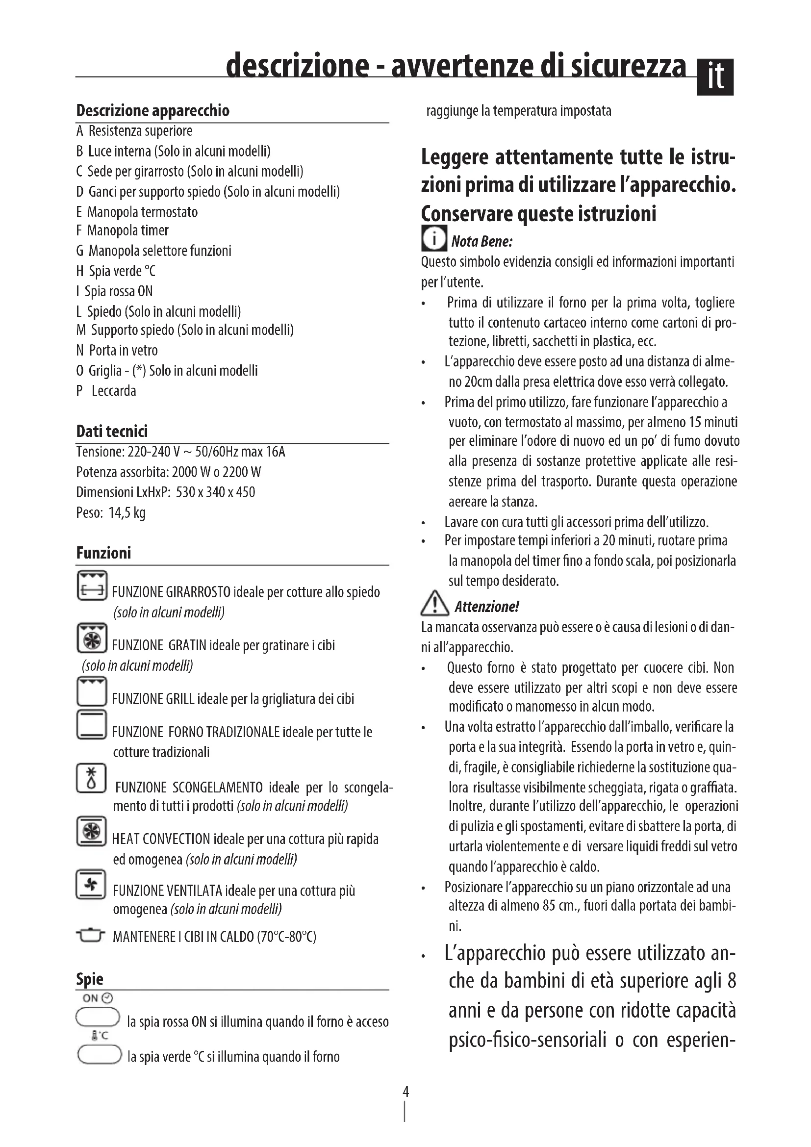Descrizione apparecchio A Resistenza superiore B Luce interna (Solo in alcuni modelli) C Sede per girarrosto (Solo in alcuni modelli) D Ganci per supporto spiedo (Solo in alcuni modelli) E Manopola termostato F Manopola timer G Manopola selettore funzioni H Spia verde °C I Spia rossa ON L Spiedo (Solo in alcuni modelli) M Supporto spiedo (Solo in alcuni modelli) N Porta in vetro O Griglia - (*) Solo in alcuni modelli P Leccarda Dati tecnici Tensione: 220-240 V ~ 50/60Hz max 16A Potenza assorbita: 2000 W o 2200 W Dimensioni LxHxP: 530 x 340 x 450 Peso: 14,5 kg Funzioni FUNZIONE GIRARROSTO ideale per cotture allo spiedo (solo in alcuni modelli) FUNZIONE GRATIN ideale per gratinare i cibi (solo in alcuni modelli) FUNZIONE GRILL ideale per la grigliatura dei cibi FUNZIONE FORNO TRADIZIONALE ideale per tutte le cotture tradizionali FUNZIONE SCONGELAMENTO ideale per lo scongela- mento di tutti i prodotti (solo in alcuni modelli) HEAT CONVECTION ideale per una cottura più rapida ed omogenea (solo in alcuni modelli) FUNZIONE VENTILATA ideale per una cottura più omogenea (solo in alcuni modelli) MANTENERE I CIBI IN CALDO (70°C-80°C) Spie la spia rossa ON si illumina quando il forno è acceso la spia verde °C si illumina quando il forno raggiunge la temperatura impostata Leggere attentamente tutte le istru- zioni prima di utilizzare l’apparecchio. Conservare queste istruzioni Nota Bene: Questo simbolo evidenzia consigli ed informazioni importanti per l’utente.
