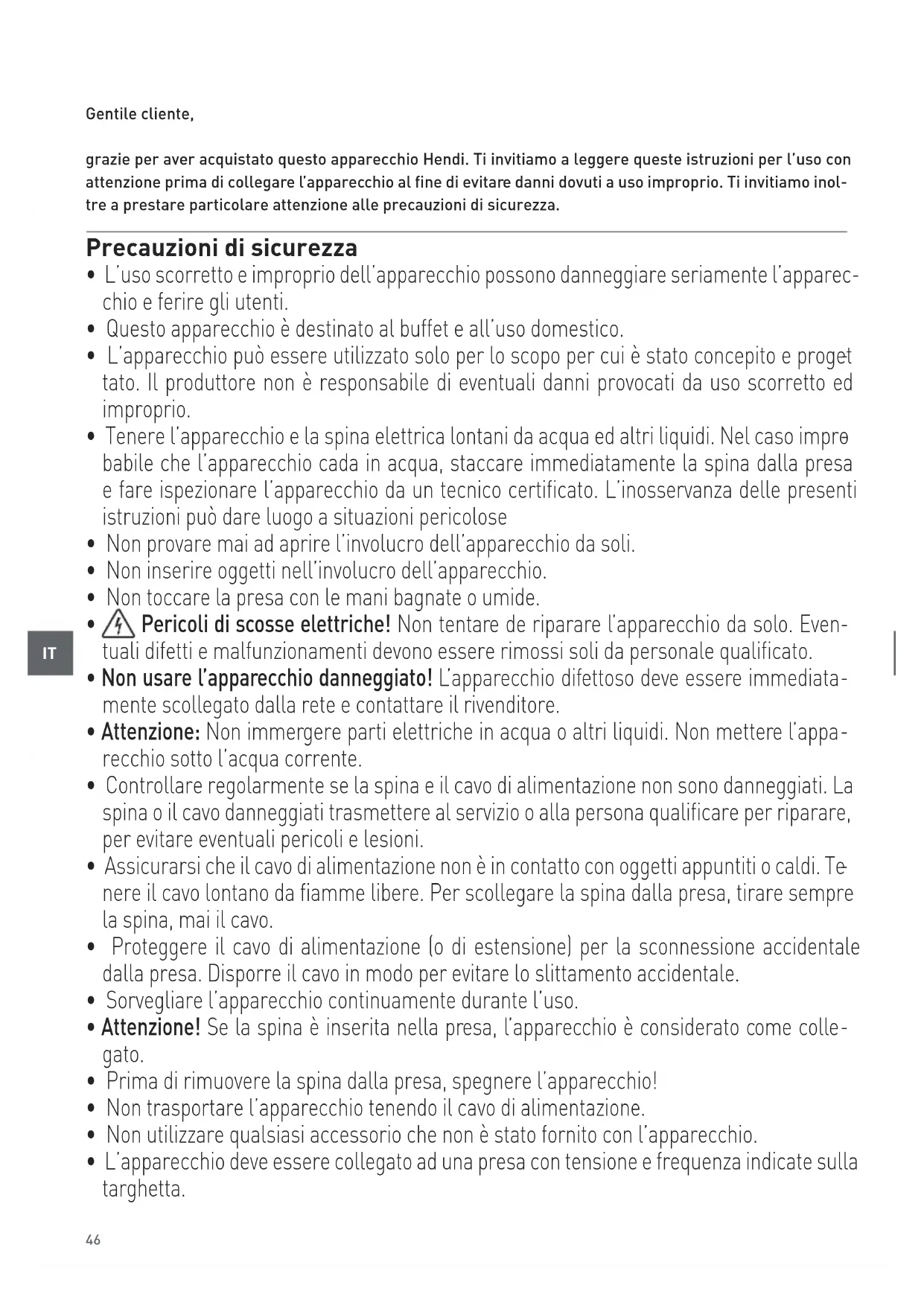 Gentile cliente, grazie per aver acquistato questo apparecchio Hendi. Ti invitiamo a leggere queste istruzioni per l’uso con attenzione prima di collegare l’apparecchio al fine di evitare danni dovuti a uso improprio. Ti invitiamo inol- tre a prestare particolare attenzione alle precauzioni di sicurezza. Precauzioni di sicurezza