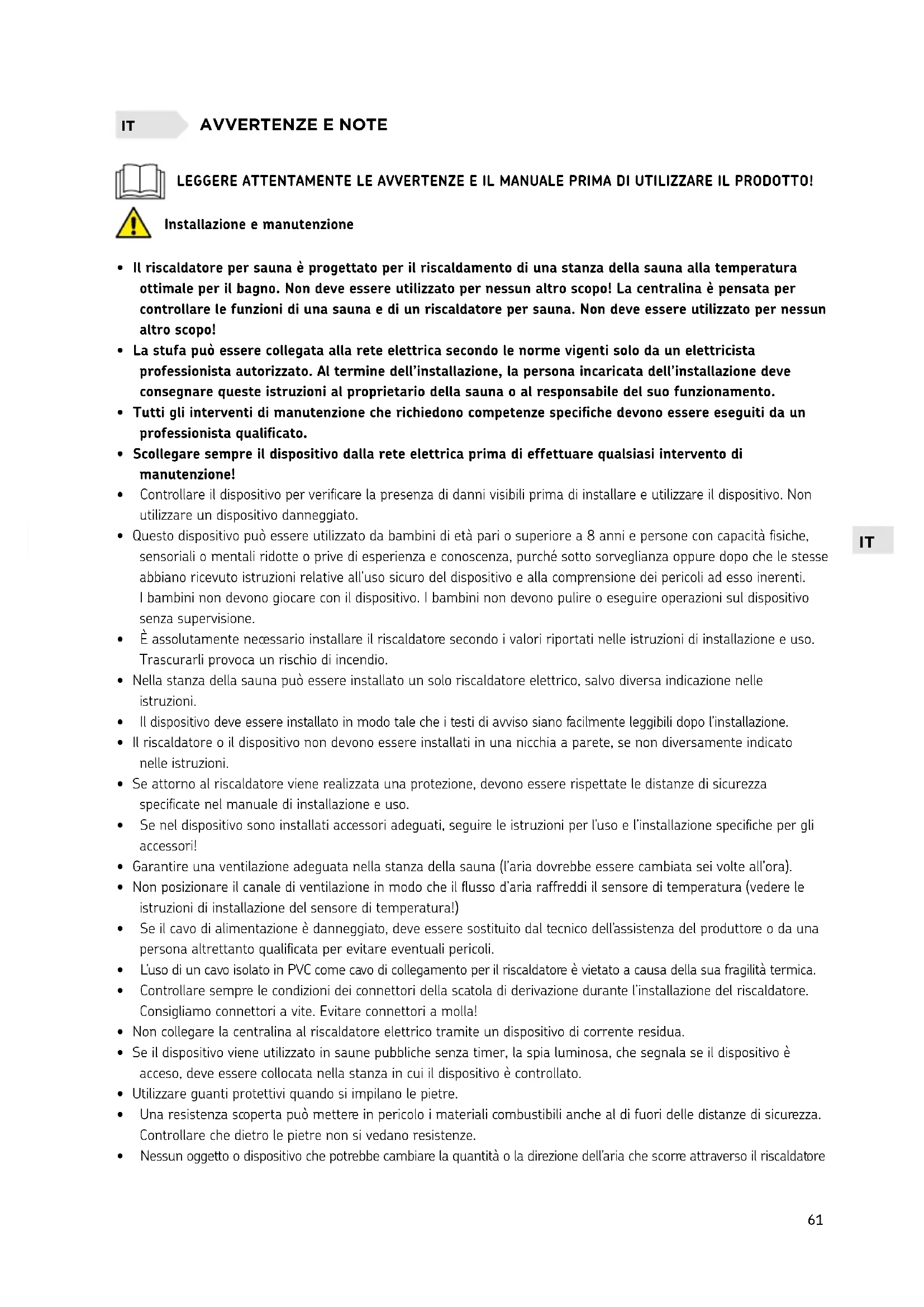 - Secondo la norma di prodotto IEC/EN 60335 -2-53 che regola le stufe elettriche per sauna, la centralina può essere utilizzata per controllare a distanza il riscaldatore una volta che la stufa o la porta della stanza della sauna è dotata di un interruttore sicuro (interruttore di sicurezza o commutatore della porta). Non coprire! Fare attenzione al vapore caldo quando si utilizza l’apparecchio!63
