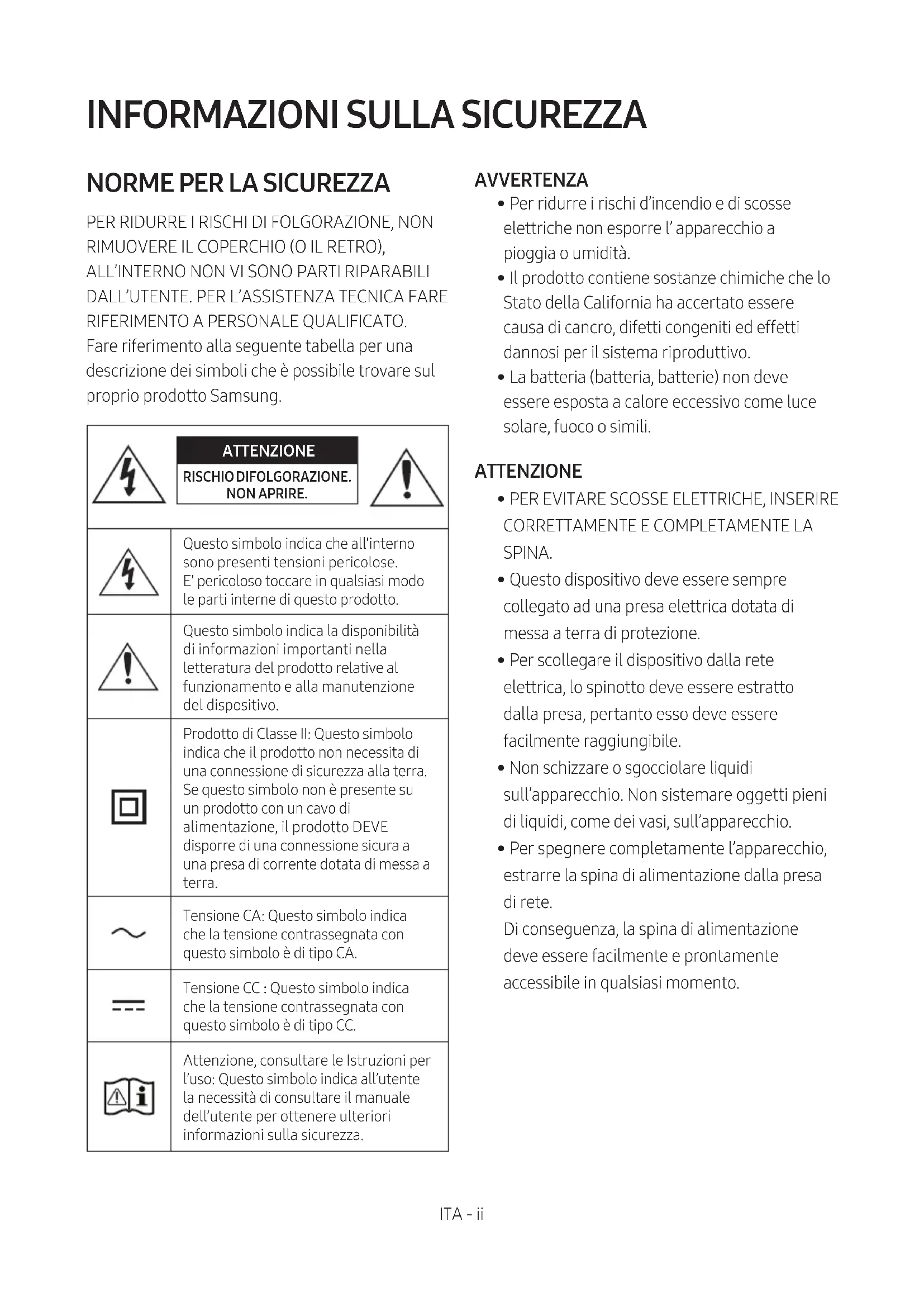 PER RIDURRE I RISCHI DI FOLGORAZIONE, NON RIMUOVERE IL COPERCHIO (O IL RETRO), ALL’INTERNO NON VI SONO PARTI RIPARABILI DALL’UTENTE. PER L’ASSISTENZA TECNICA FARE RIFERIMENTO A PERSONALE QUALIFICATO. Fare riferimento alla seguente tabella per una descrizione dei simboli che è possibile trovare sul proprio prodotto Samsung. ATTENZIONE RISCHIO DIFOLGORAZIONE. NON APRIRE.Questo simbolo indica che all'interno sono presenti tensioni pericolose. E' pericoloso toccare in qualsiasi modo le parti interne di questo prodotto.Questo simbolo indica la disponibilità di informazioni importanti nella letteratura del prodotto relative al funzionamento e alla manutenzione del dispositivo.Prodotto di Classe II: Questo simbolo indica che il prodotto non necessita di una connessione di sicurezza alla terra. Se questo simbolo non è presente su un prodotto con un cavo di alimentazione, il prodotto DEVE disporre di una connessione sicura a una presa di corrente dotata di messa a terra.Tensione CA: Questo simbolo indica che la tensione contrassegnata con questo simbolo è di tipo CA.Tensione CC : Questo simbolo indica che la tensione contrassegnata con questo simbolo è di tipo CC.Attenzione, consultare le Istruzioni per l’uso: Questo simbolo indica all’utente la necessità di consultare il manuale dell’utente per ottenere ulteriori informazioni sulla sicurezza. AVVERTENZA