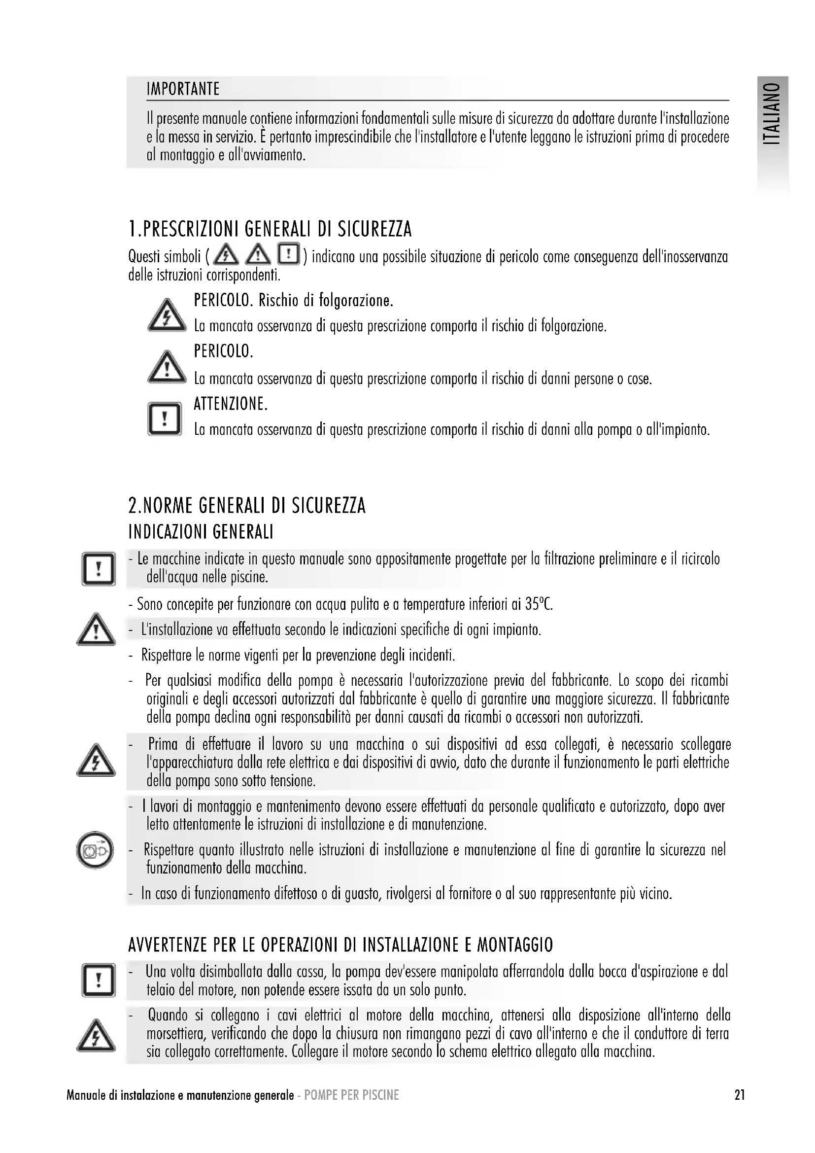 Considerare questo elenco come indicativo e non vincolante ai fini della sicurezza, dato che possono esistere norme di sicurezza specifiche in normative particolari. Le istruzioni di installazione, uso e mantenimento contenute in questo manuale, a causa della complessità dei casi trattati, non pretendono di esaminare tutti i casi possibile e immaginabili di servizio e mantenimento. Qualora si rendessero necessarie istruzioni supplementari o si verificassero problemi particolari, non si esiti a mettersi in contatto con il rivolgersi al Servizio di Assistenza Tecnica piü vicino. L’installazione elettrica deve essere eseguita da personale professionale qualificato in installazioni elettriche. Questo apparato non è destinato a persone con capacità fisiche, sensoriali o mentali ridotte o senza esperienza, a meno che non abbiamo ricevuto supervisione o istruzioni in merito al suo uso da un responsabile della sicurezza. Non permetta né ai bambini né agli adulti di appoggiarsi o di sedersi sull’attrezzatura. I bambini devono essere controllati per assicurarsi che non giochino con l’attrezzatura.ITALIANO Manuale di instalazione e manutenzione generale - POMPE PER PISCINE 23