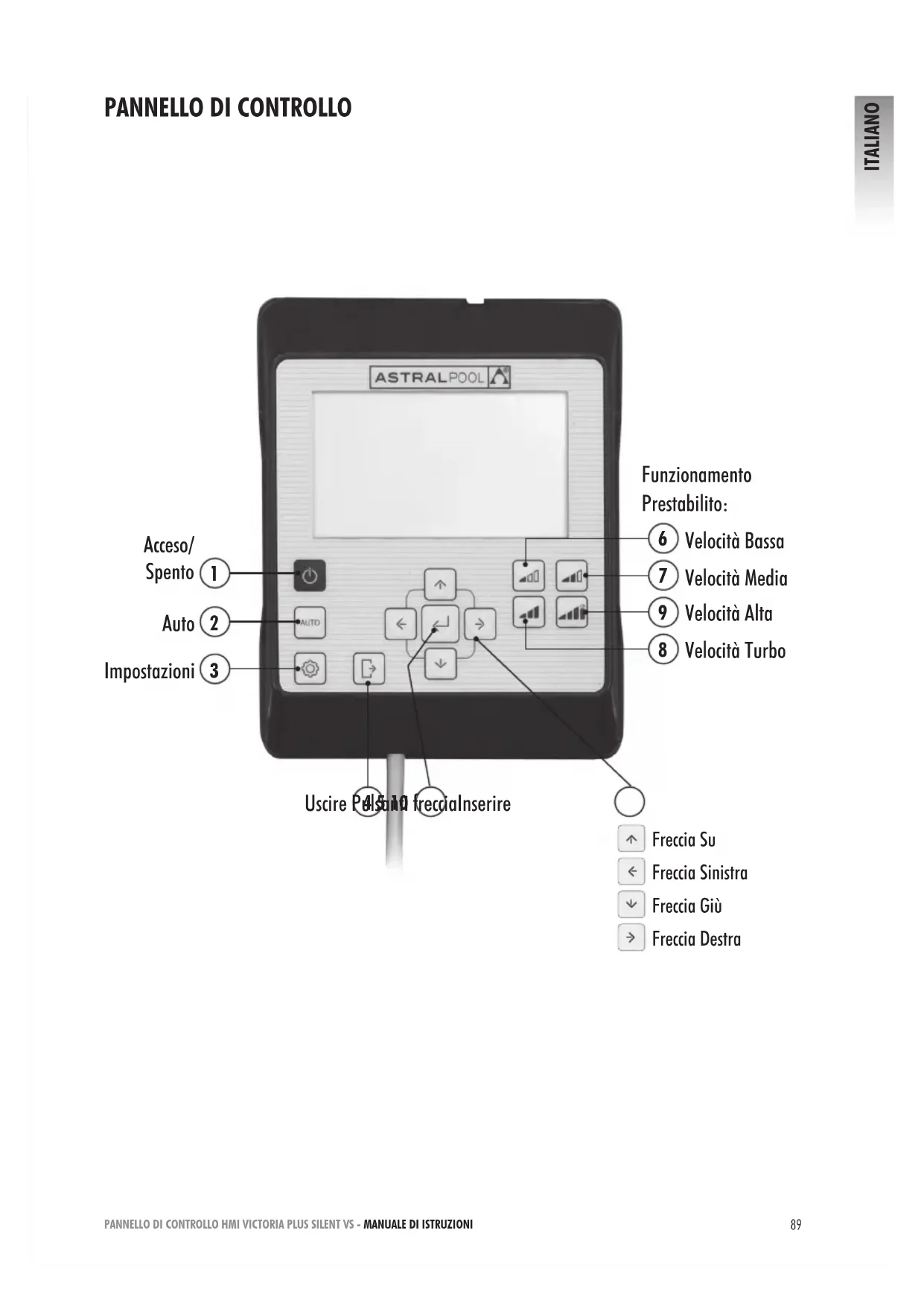 Impostazioni Uscire Pulsanti frecciaInserire Funzionamento Prestabilito: Velocità Bassa Velocità Media Velocità Alta Velocità Turbo Freccia Su Freccia Giù Freccia Sinistra Freccia DestraPANNELLO DI CONTROLLO HMI VICTORIA PLUS SILENT VS - MANUALE DI ISTRUZIONI