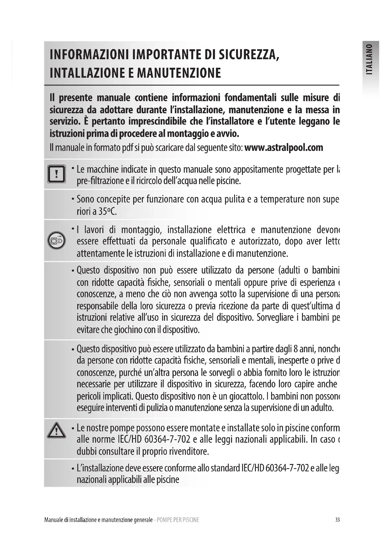 Il presente manuale contiene informazioni fondamentali sulle misure di sicurezza da adottare durante l’installazione, manutenzione e la messa in servizio. È pertanto imprescindibile che l’installatore e l’utente leggano le istruzioni prima di procedere al montaggio e avvio. Il manuale in formato pdf si può scaricare dal seguente sito: www.astralpool.com