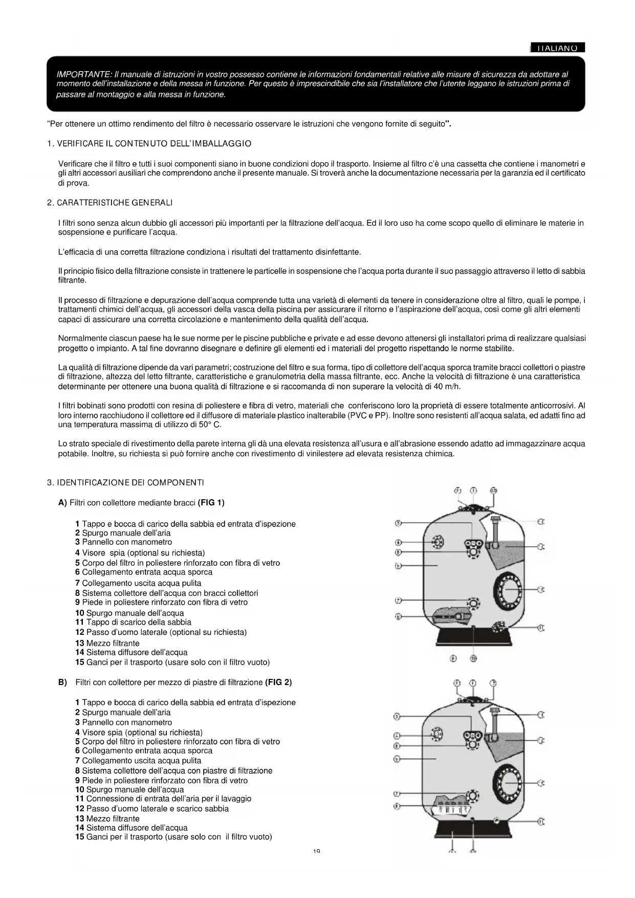 A) Filtri con collettore mediante bracci (FIG 1) 1 Tappo e bocca di carico della sabbia ed entrata d’ispezione 2 Spurgo manuale dell’aria 3 Pannello con manometro 4 Visore spia (optional su richiesta) 5 Corpo del filtro in poliestere rinforzato con fibra di vetro 6 Collegamento entrata acqua sporca 7 Collegamento uscita acqua pulita 8 Sistema collettore dell’acqua con bracci collettori 9 Piede in poliestere rinforzato con fibra di vetro 10 Spurgo manuale dell’acqua 11 Tappo di scarico della sabbia 12 Passo d’uomo laterale (optional su richiesta) 13 Mezzo filtrante 14 Sistema diffusore dell’acqua 15 Ganci per il trasporto (usare solo con il filtro vuoto) B) Filtri con collettore per mezzo di piastre di filtrazione (FIG 2) 1 Tappo e bocca di carico della sabbia ed entrata d’ispezione 2 Spurgo manuale dell’aria 3 Pannello con manometro 4 Visore spia (optional su richiesta) 5 Corpo del filtro in poliestere rinforzato con fibra di vetro 6 Collegamento entrata acqua sporca 7 Collegamento uscita acqua pulita 8 Sistema collettore dell’acqua con piastre di filtrazione 9 Piede in poliestere rinforzato con fibra di vetro 10 Spurgo manuale dell’acqua 11 Connessione di entrata dell’aria per il lavaggio 12 Passo d’uomo laterale e scarico sabbia 13 Mezzo filtrante 14 Sistema diffusore dell’acqua 15 Ganci per il trasporto (usare solo con il filtro vuoto)